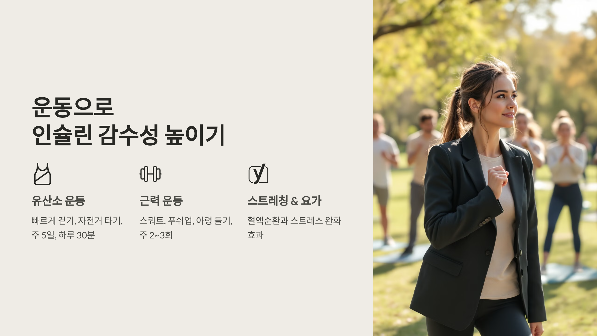 운동은 혈당을 낮추고 인슐린 감수성을 높이는 가장 효과적인 방법이에요.