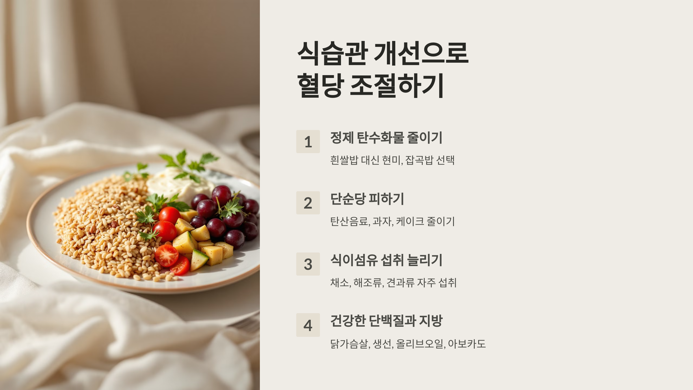- 혈당을 천천히 올리는 저혈당지수(GI) 식품을 선택하세요.