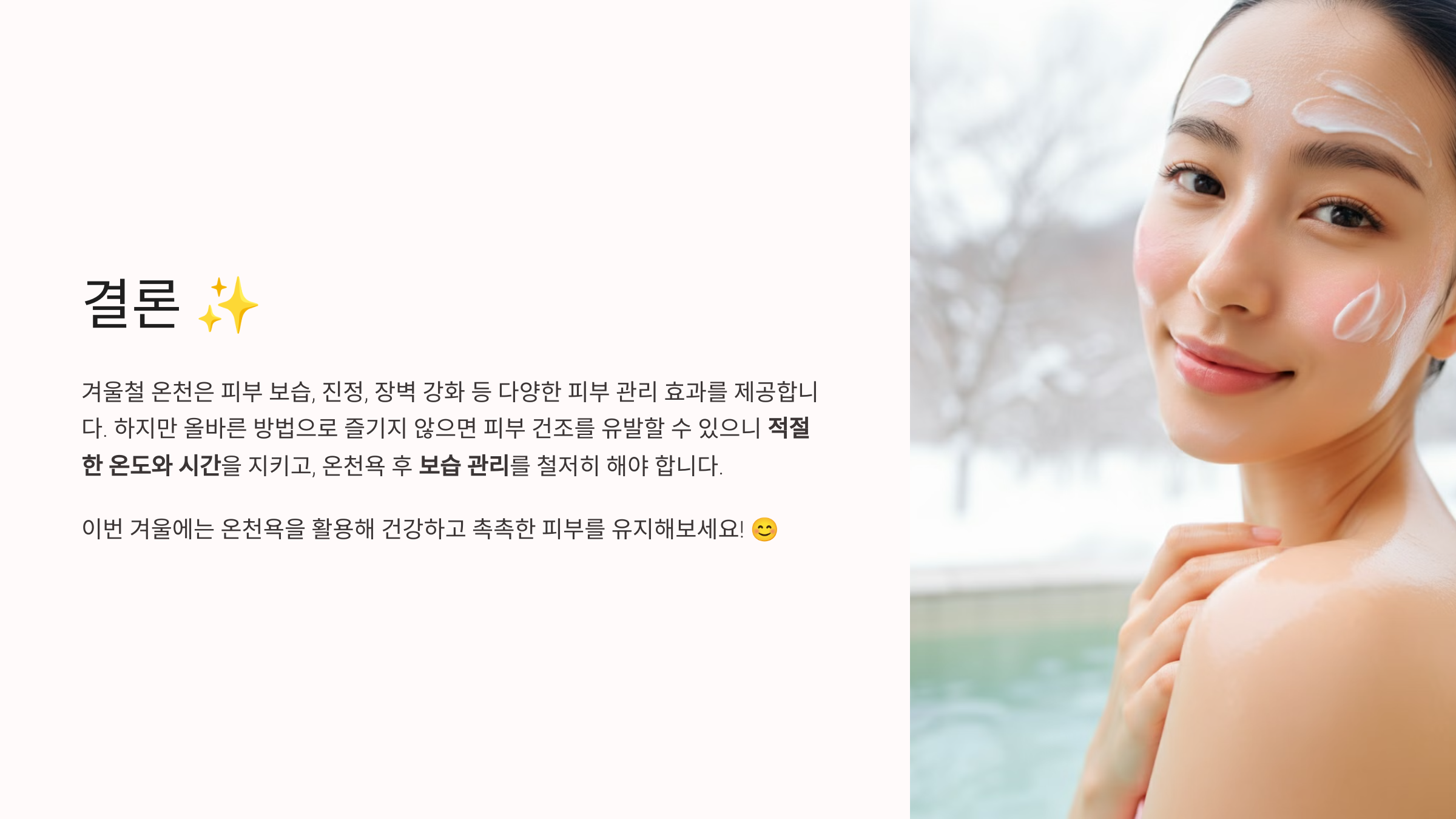 이번 겨울에는 온천욕을 활용해 건강하고 촉촉한 피부를 유지해보세요! 😊 궁금한 점이나 온천 관리 팁이 있다면 댓글로 공유해주세요. 💬