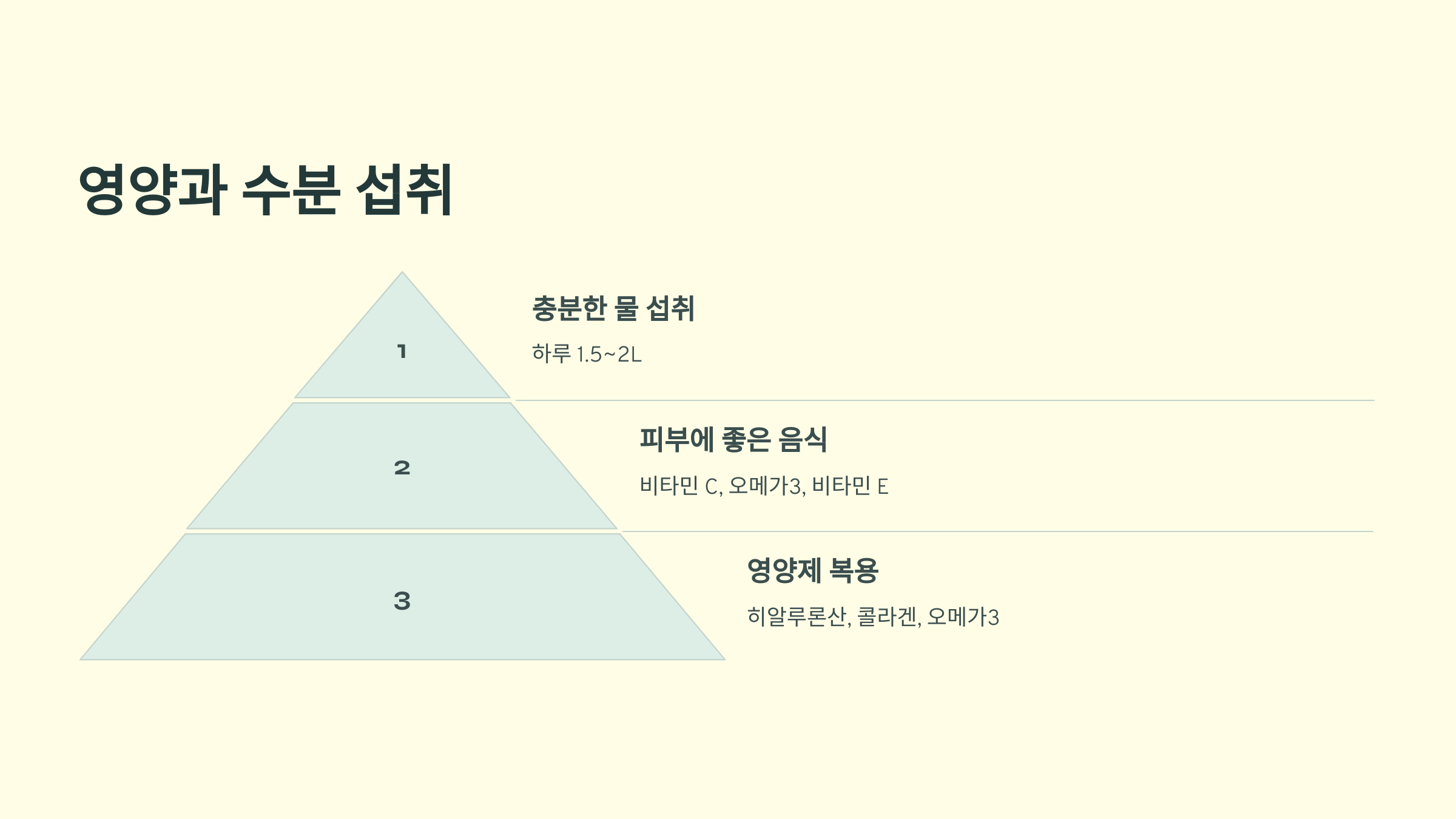 - 히알루론산, 콜라겐, 오메가3 같은 영양제를 추가로 섭취하면 피부 건강을 더욱 지킬 수 있습니다.