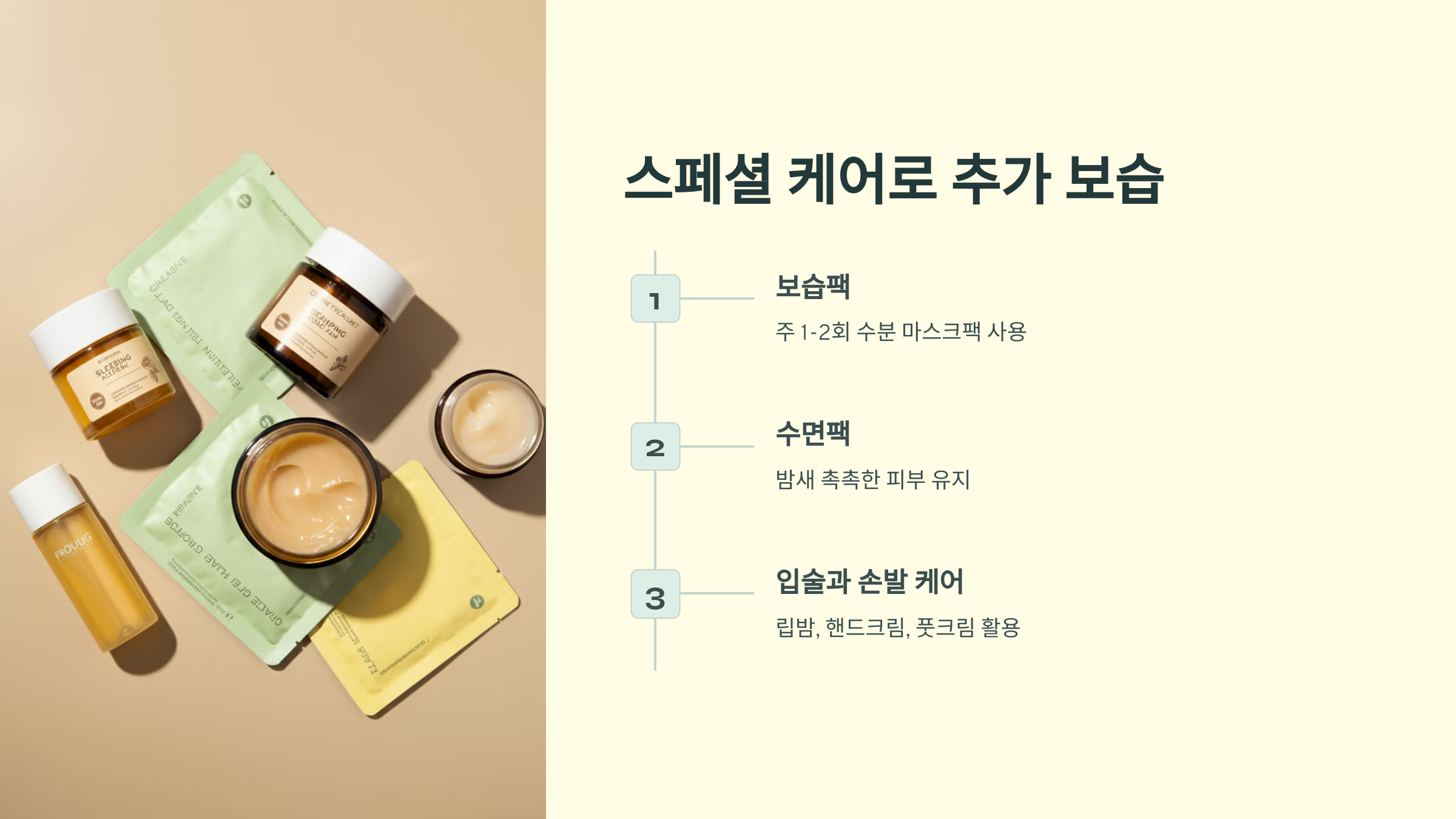 - 보습제 사용 후 천연 오일(호호바 오일, 아르간 오일)을 얇게 덧발라 수분 증발을 방지하세요.