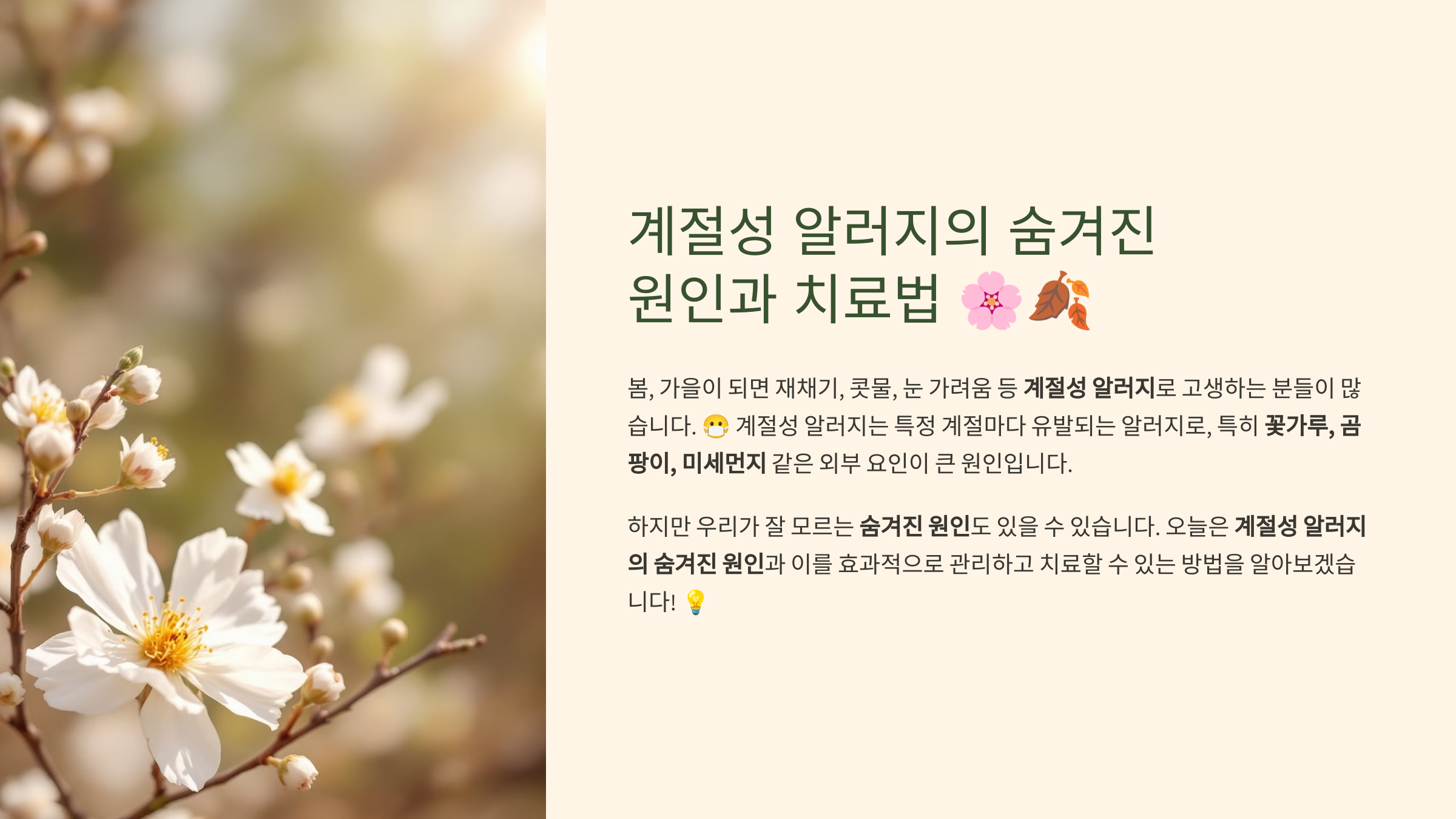 오늘은 계절성 알러지의 숨겨진 원인과 이를 효과적으로 관리하고 치료할 수 있는 방법을 알아보겠습니다! 💡