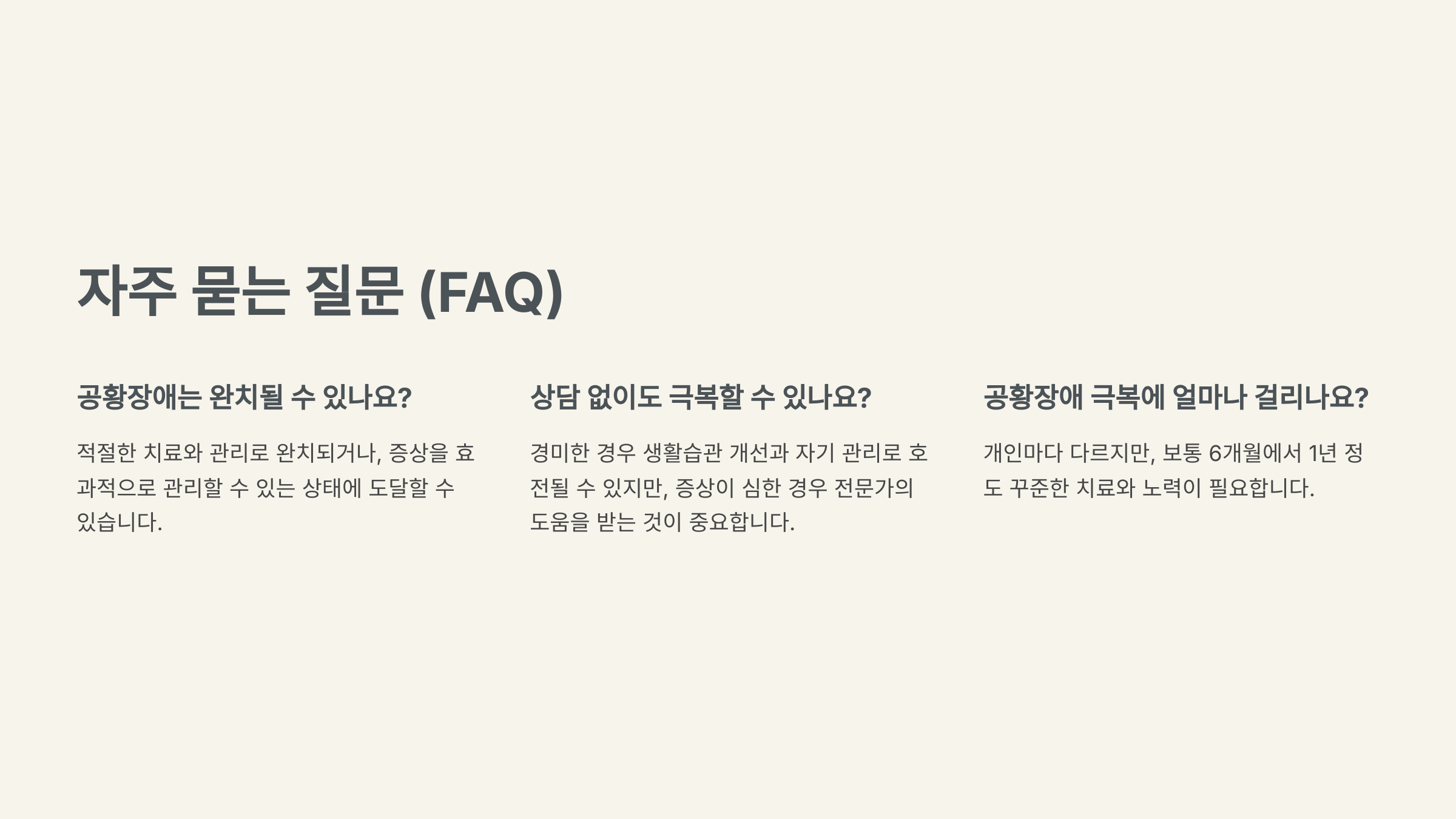 - 규칙적인 수면과 운동, 균형 잡힌 식습관은 공황장애 극복에 필수적입니다.
