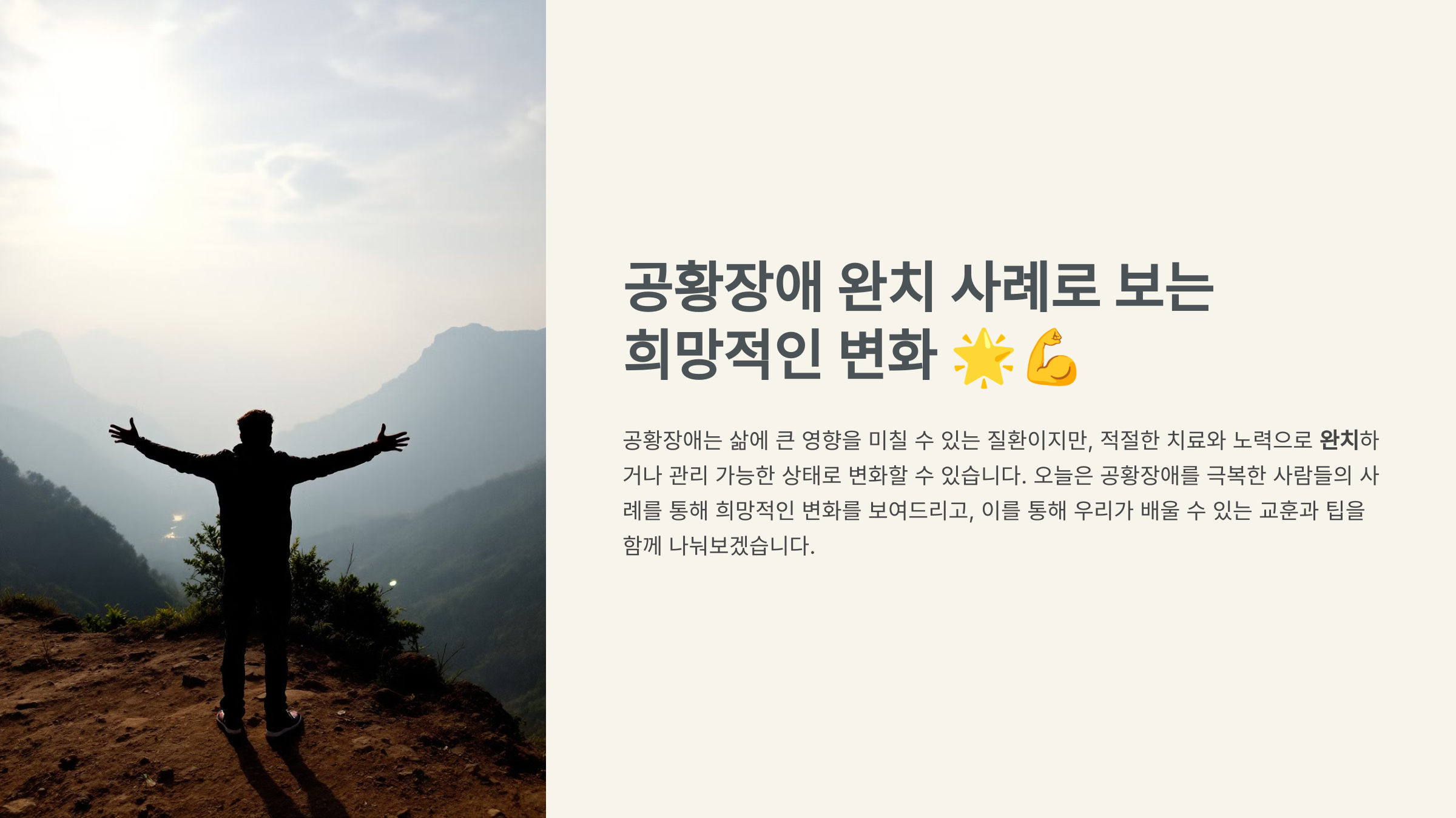 공황장애는 삶에 큰 영향을 미칠 수 있는 질환이지만, 적절한 치료와 노력으로 완치하거나 관리 가능한 상태로 변화할 수 있습니다. 오늘은 공황장애를 극복한 사람들의 사례를 통해 희망적인 변화를 보여드리고, 이를 통해 우리가 배울 수 있는 교훈과 팁을 함께 나눠보겠습니다.
