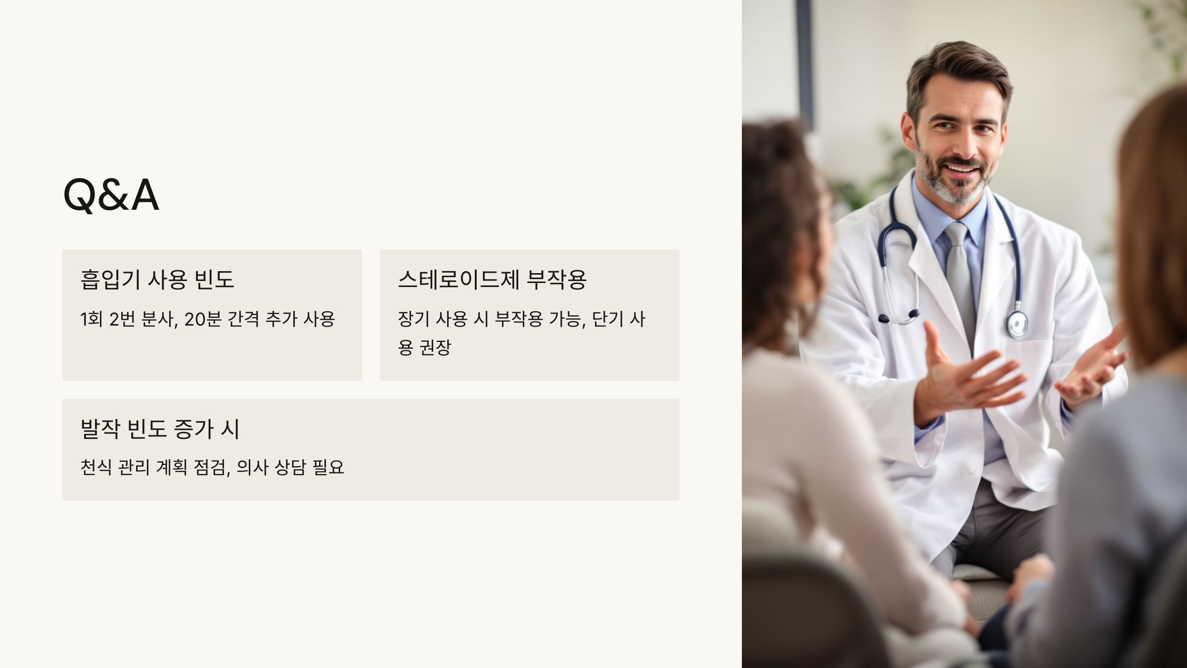천식 발작이 잦다면 정기적인 천식 관리 계획을 점검하고, 흡입용 스테로이드제 사용 여부를 의사와 상담하세요.