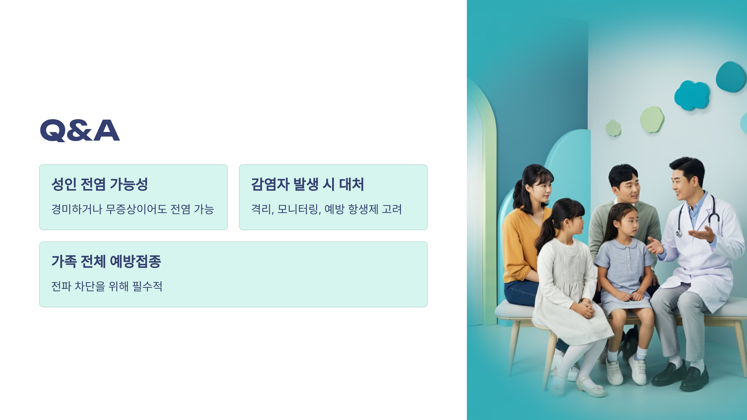 가족 내 전염을 막기 위해 예방접종을 정기적으로 확인하고, 철저한 개인 위생 관리를 실천하세요. 우리 가족과 주변 사람들의 건강을 위해 오늘부터 예방을 시작하세요! 😊