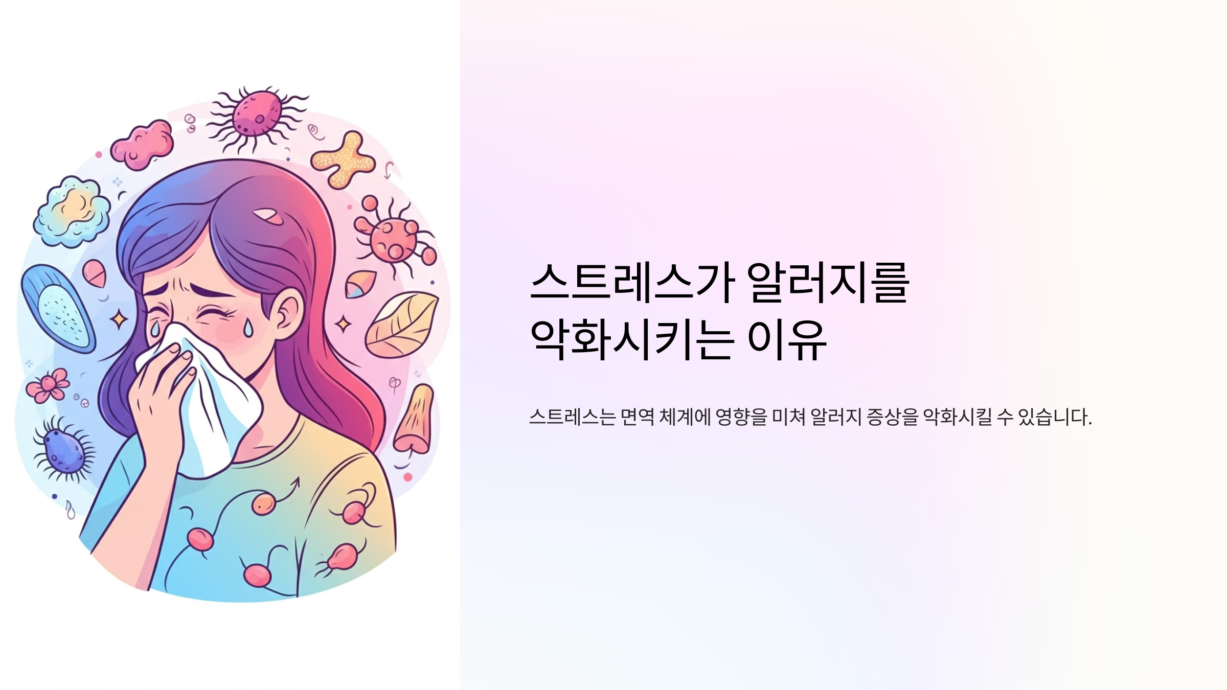 - 만성 스트레스는 염증 반응을 촉진하며, 이는 알러지로 인한 가려움, 두드러기, 코막힘 등의 증상을 더 심하게 만듭니다.