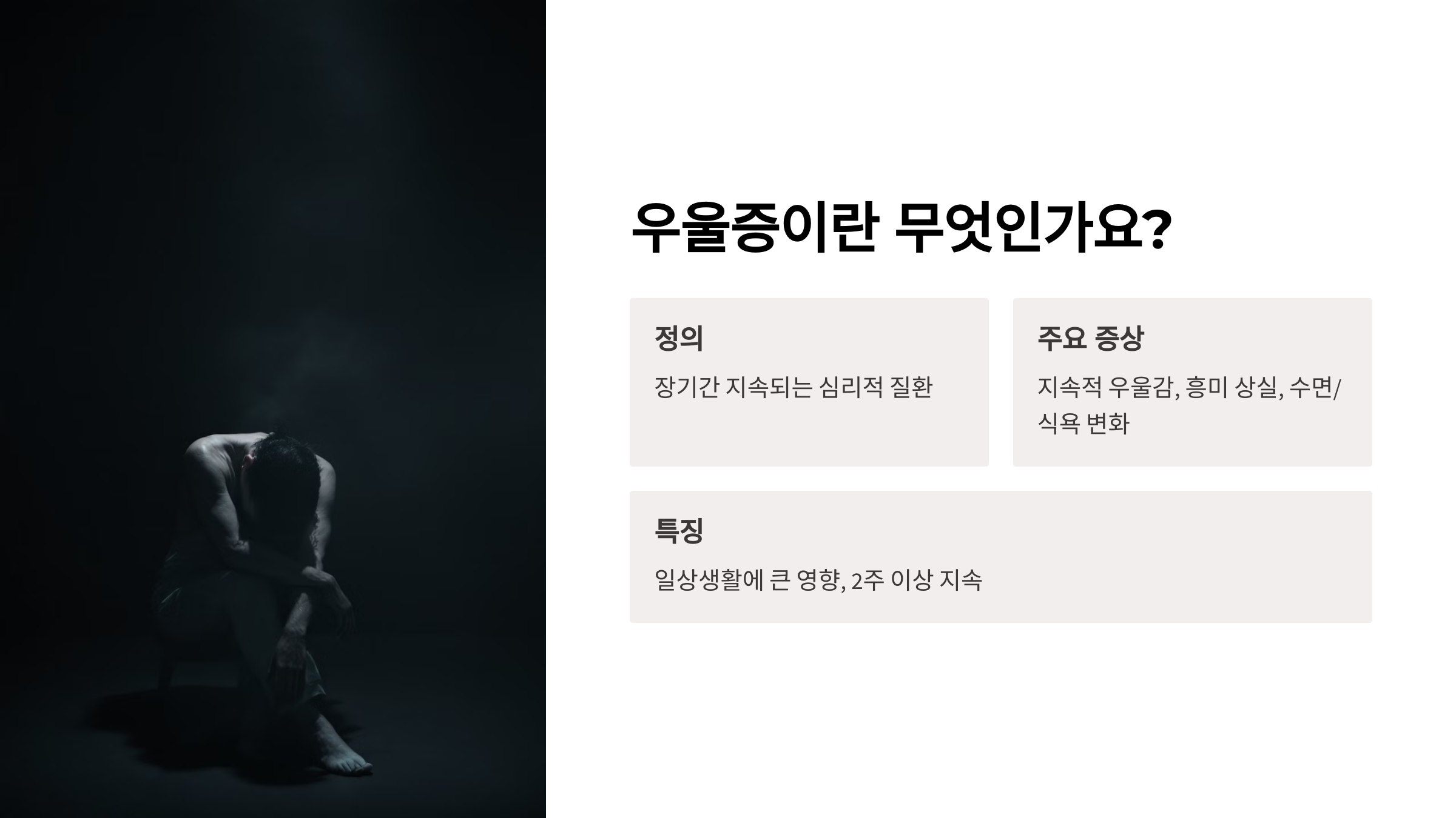 우울증은 단순한 스트레스가 아니라 장기간 지속되는 심리적 질환입니다. 우울감, 무기력감, 흥미 상실이 주요 증상이며, 일상생활에 큰 영향을 미쳐요.