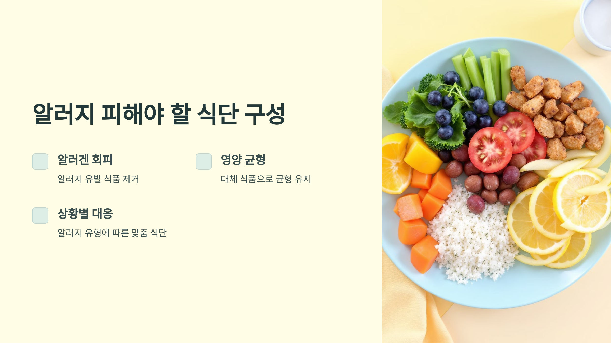 알러지가 있는 경우, 알러겐을 피하면서 영양 균형을 유지하는 것이 중요합니다. 아래는 상황별로 피해야 할 음식과 대체 옵션을 정리했습니다.