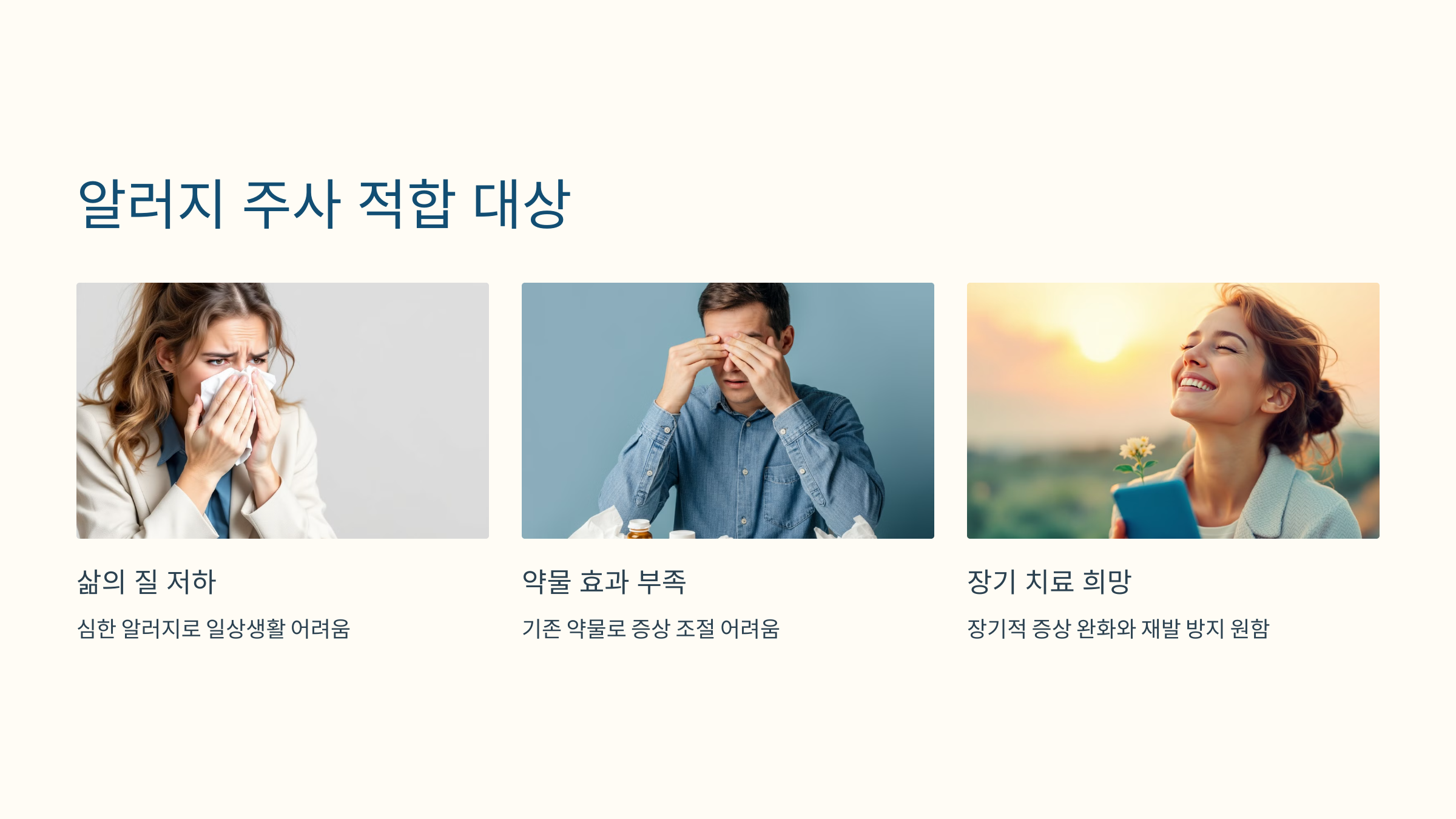 - 알러지 주사는 장기적으로 증상을 줄이고, 재발 가능성을 낮춰줍니다.