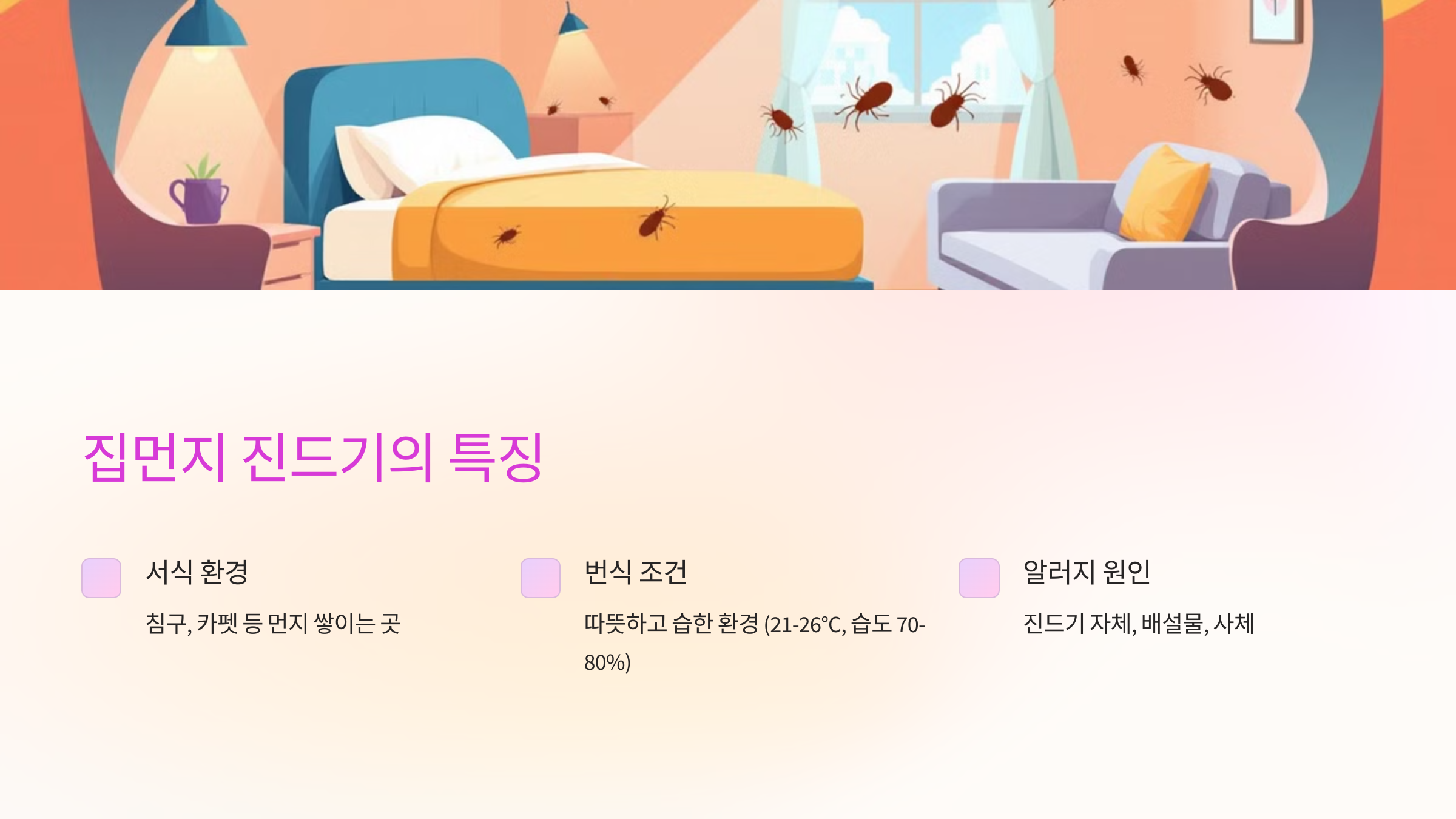 26°C, 습도 7080%)에서 번식력이 매우 강합니다. - 집먼지 진드기 자체뿐만 아니라, 이들이 남긴 배설물과 사체가 알러지의 주된 원인입니다.