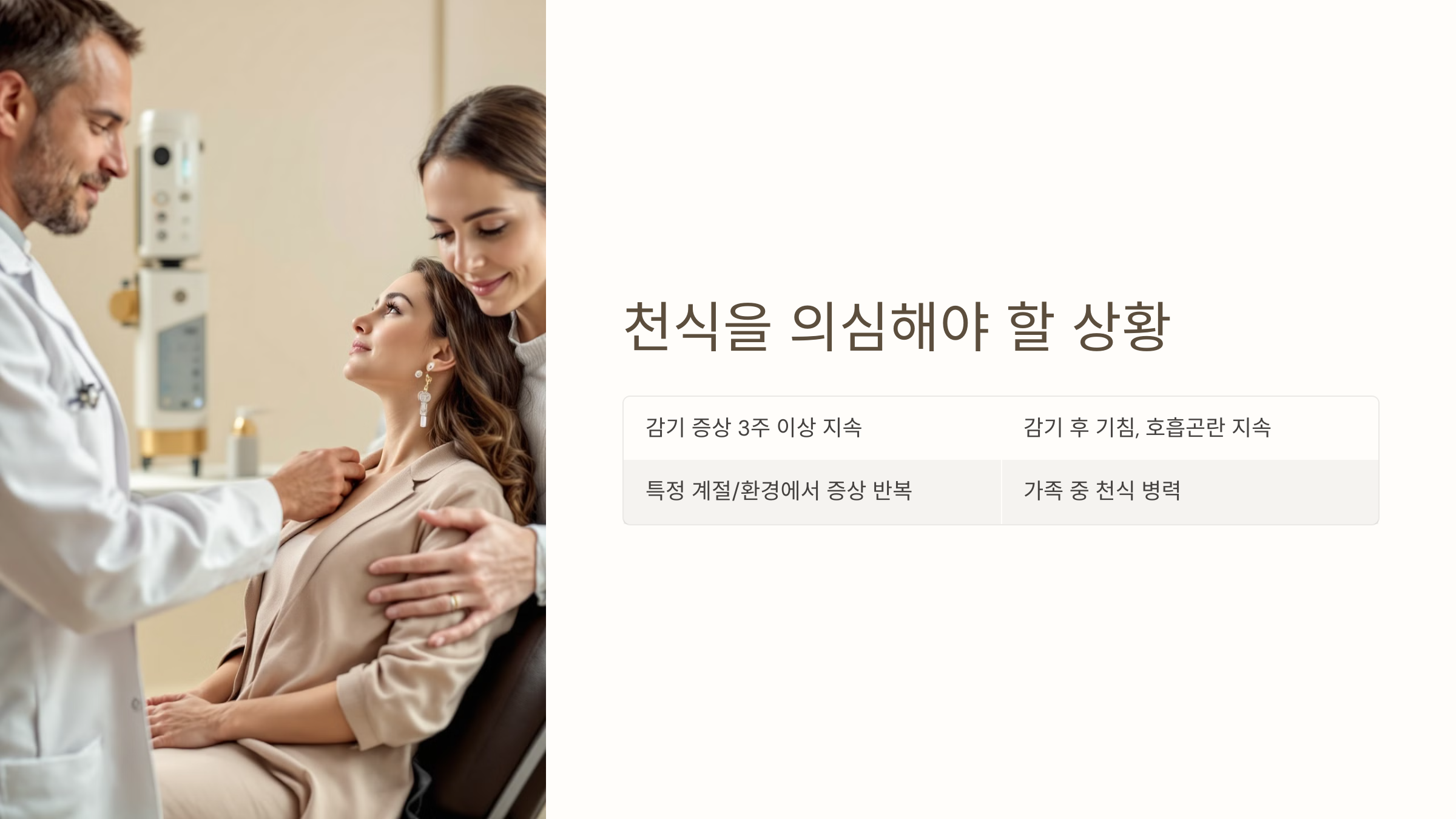 이런 상황이라면 반드시 병원을 방문하여 폐기능 검사나 알레르기 검사를 통해 천식을 진단받는 것이 중요합니다.