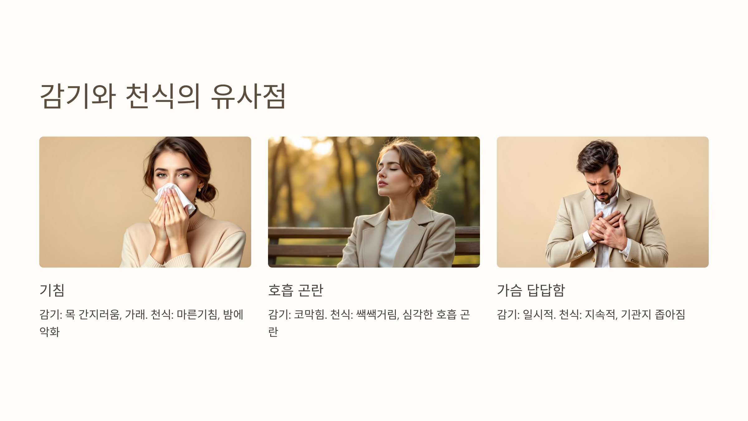 천식과 감기는 몇 가지 공통된 증상을 보이기 때문에 혼동을 일으키기 쉽습니다. 특히, 아래의 증상들은 두 질환 모두에서 나타날 수 있습니다:
