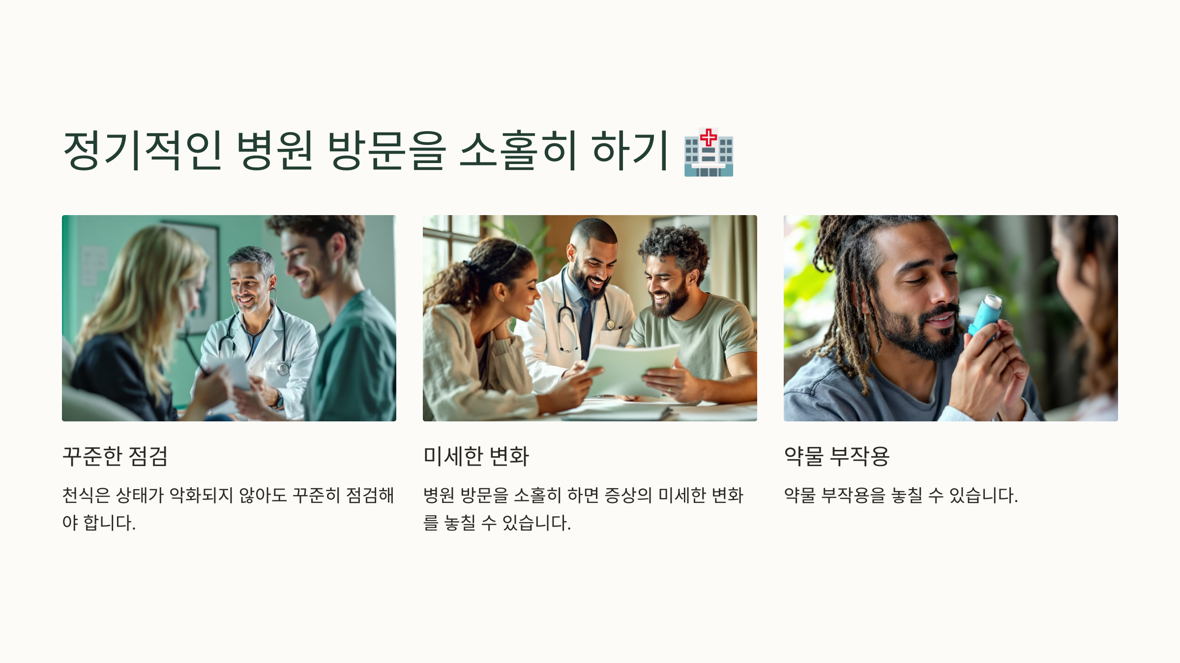 - 병원 방문을 소홀히 하면 증상의 미세한 변화나 약물 부작용을 놓칠 수 있습니다.