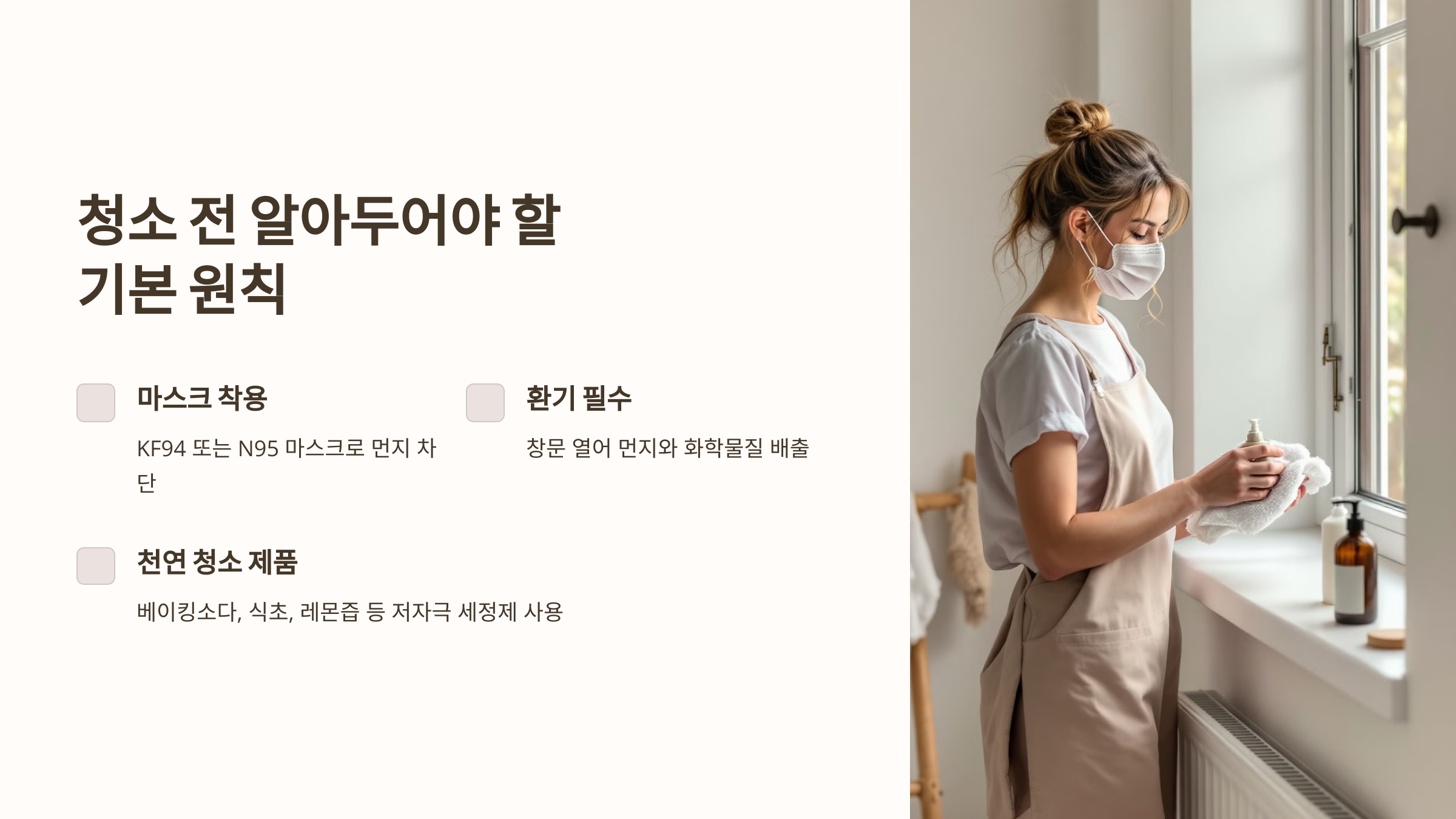 청소 중 먼지가 공중에 퍼지거나 화학 세제를 사용하면 증상이 악화될 수 있습니다. 따라서 마스크 착용, 천연 세제 사용, 물걸레 청소를 권장합니다.