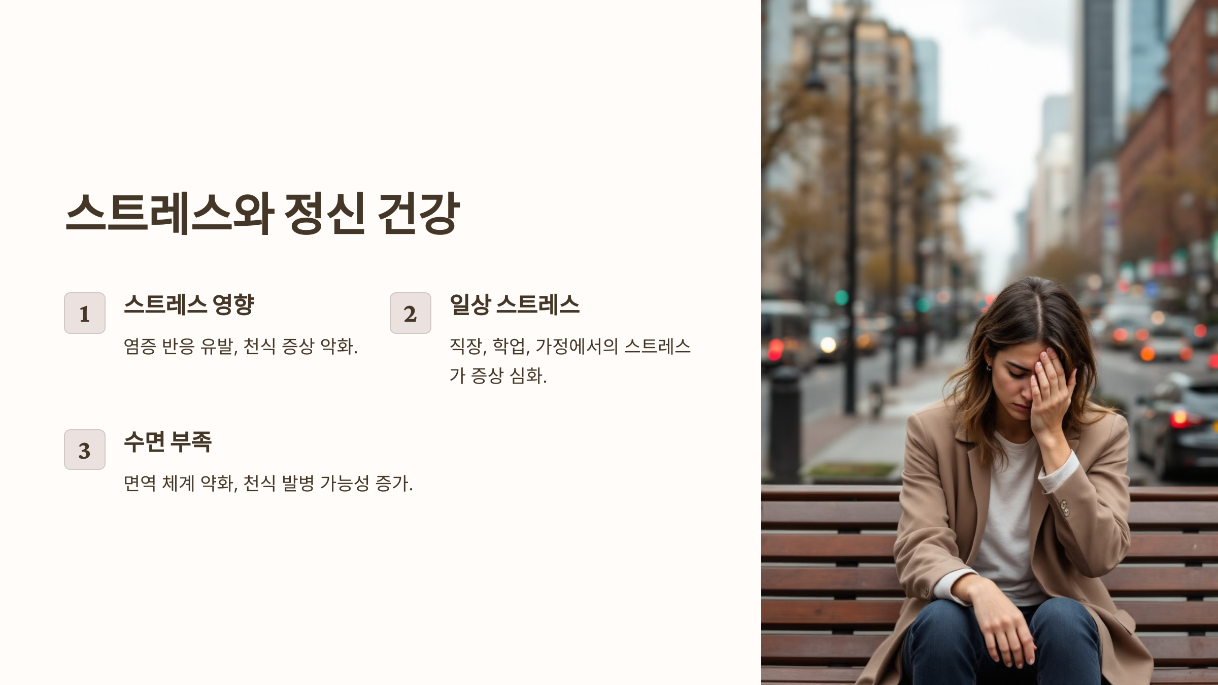 - 스트레스는 염증 반응을 유발하고, 천식 증상을 악화시킵니다.
