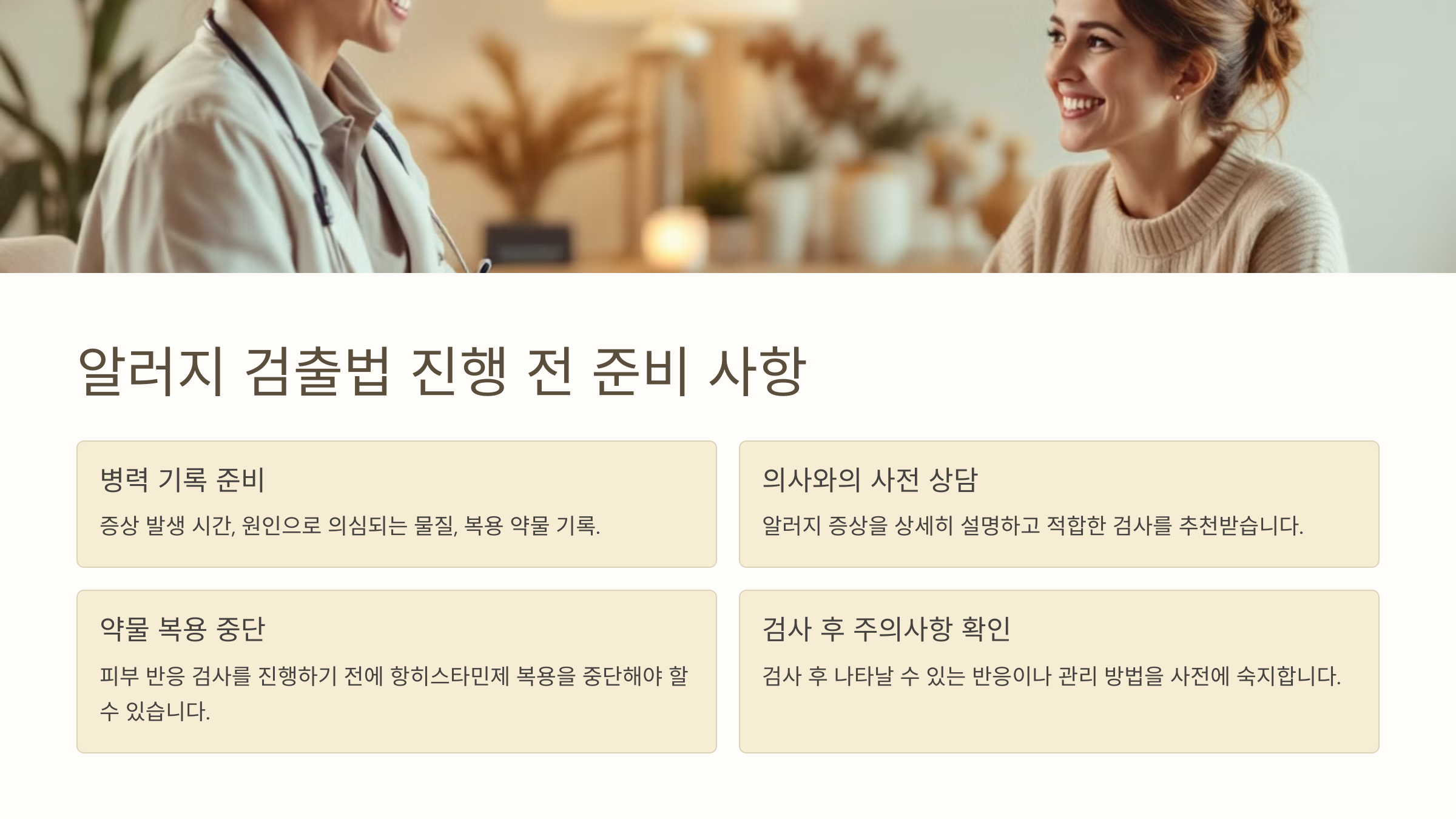 - 알러지 증상을 상세히 설명하고 적합한 검사를 추천받습니다.