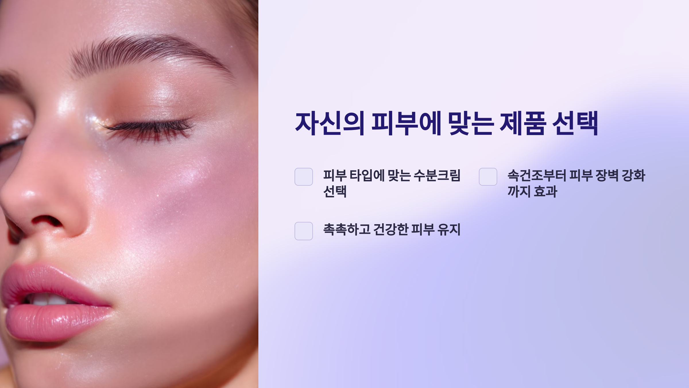 피부 타입에 따라 알맞은 수분크림을 선택해 꾸준히 사용하면 속건조부터 피부 장벽 강화까지 효과를 볼 수 있습니다.