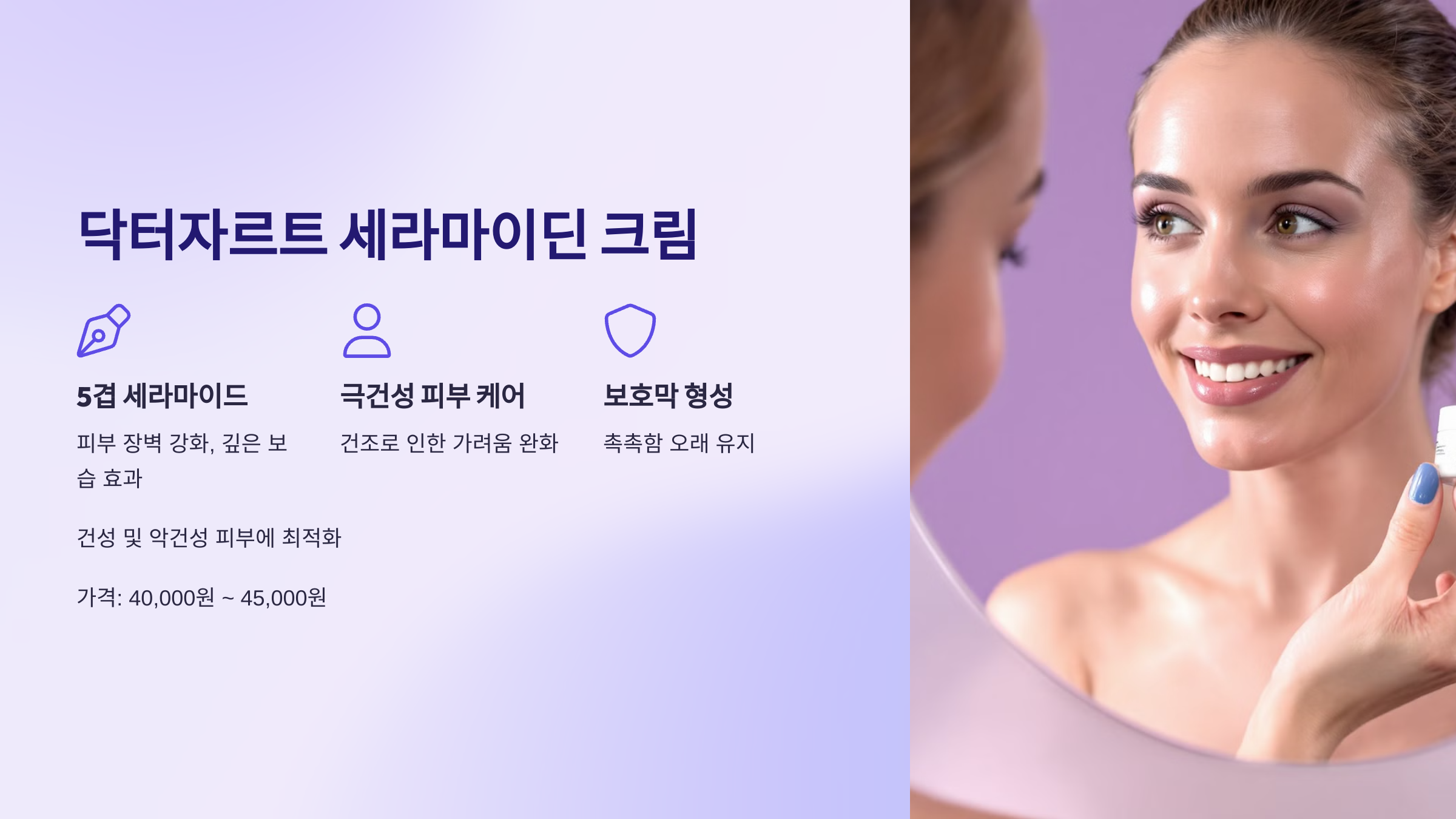 - 건성 피부: 보습력이 강한 크림 타입으로 세라마이드, 시어버터 성분을 포함한 제품 선택.