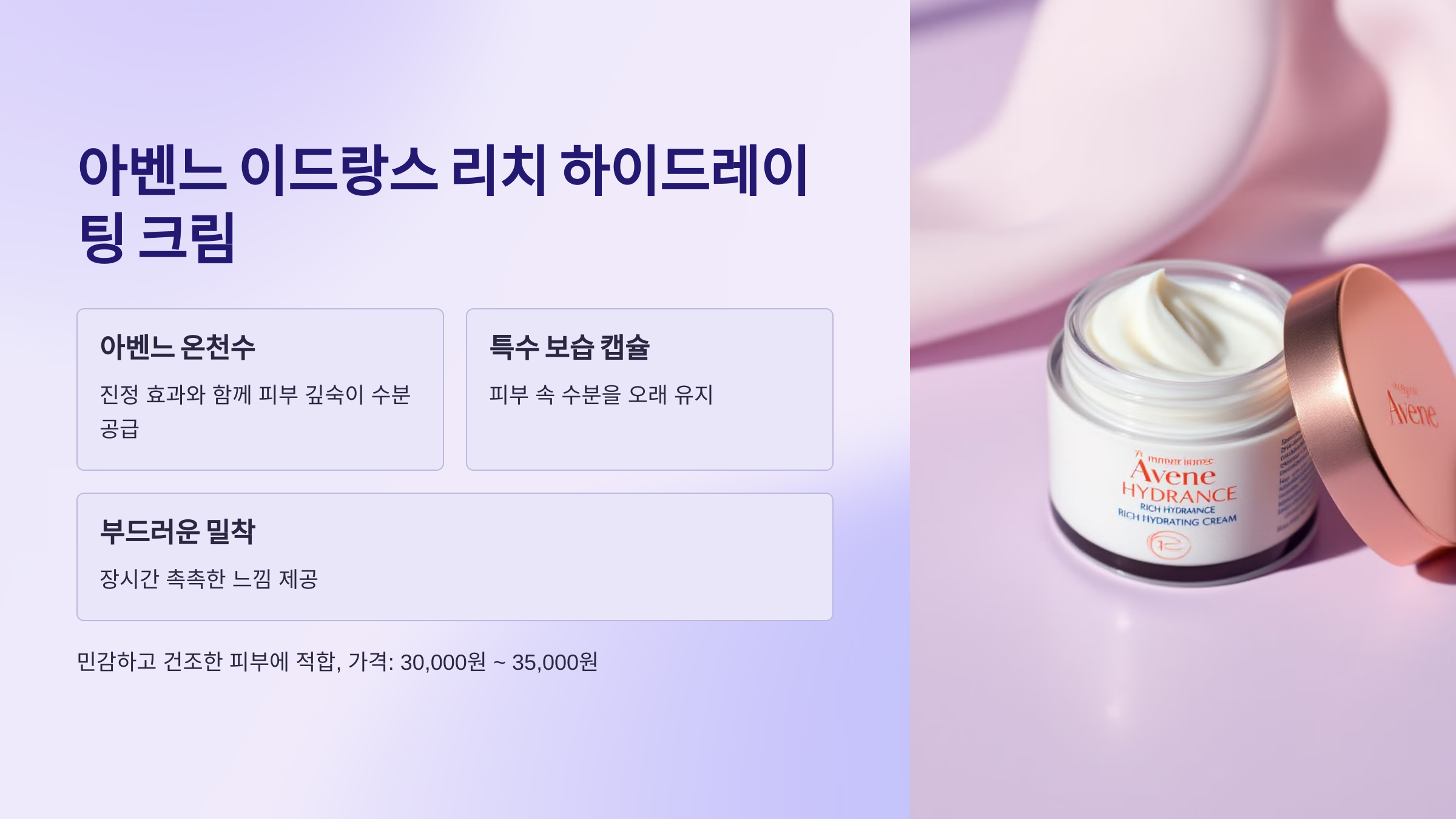 - 아벤느 온천수: 진정 효과와 함께 피부 깊숙이 수분 공급.