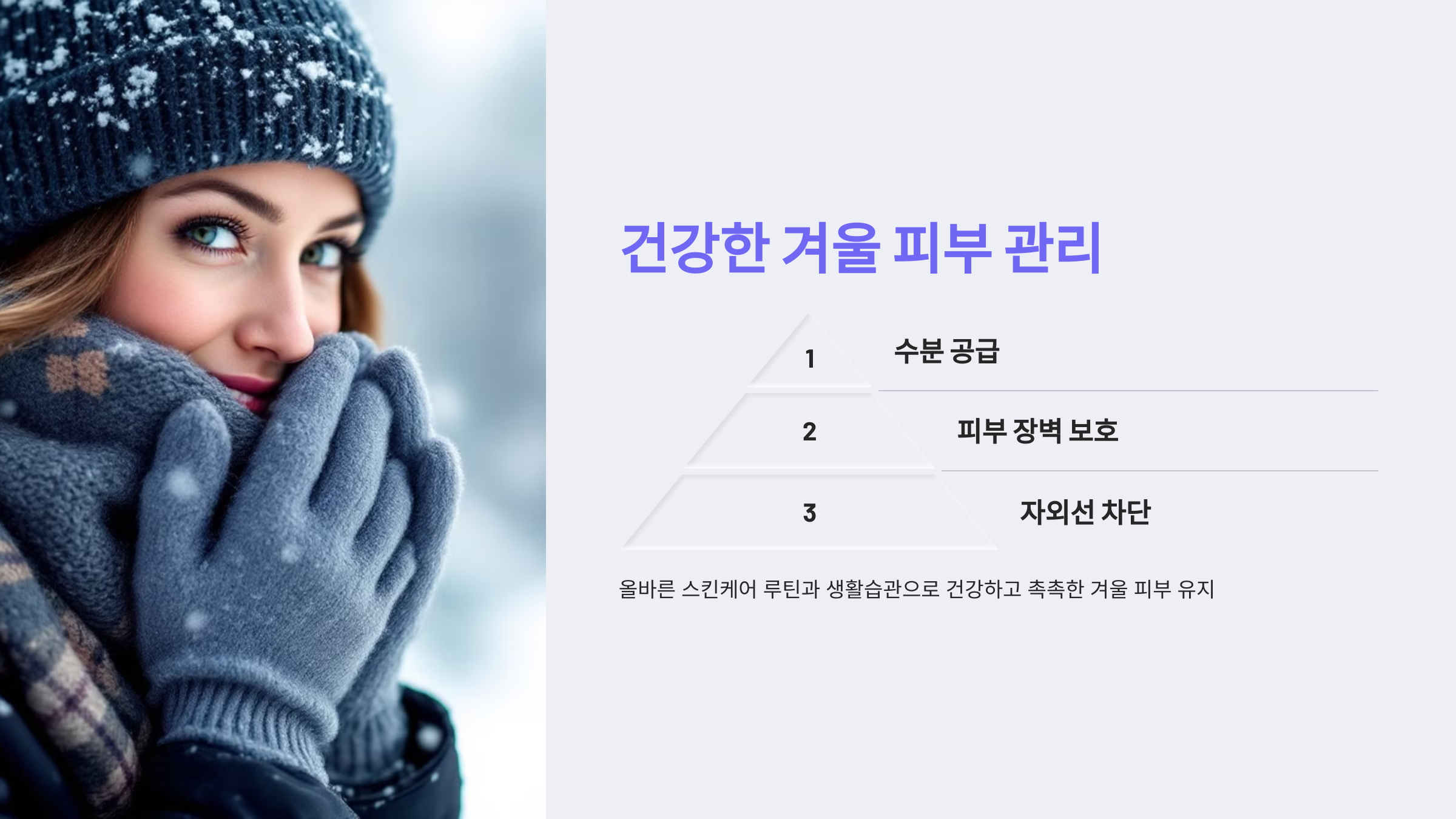 겨울철 피부 손상을 막으려면 수분 공급, 피부 장벽 보호, 자외선 차단이 가장 중요합니다.