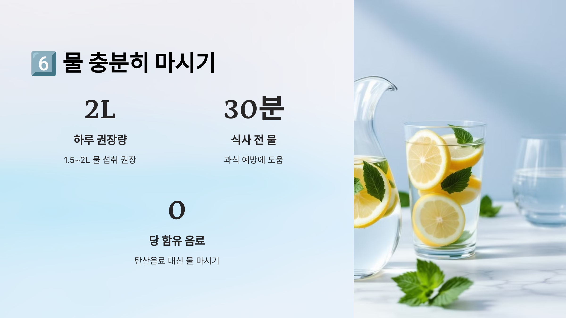 👉 식사 30분 전에 한 컵의 물을 마시면 포만감 유지에 좋아요.