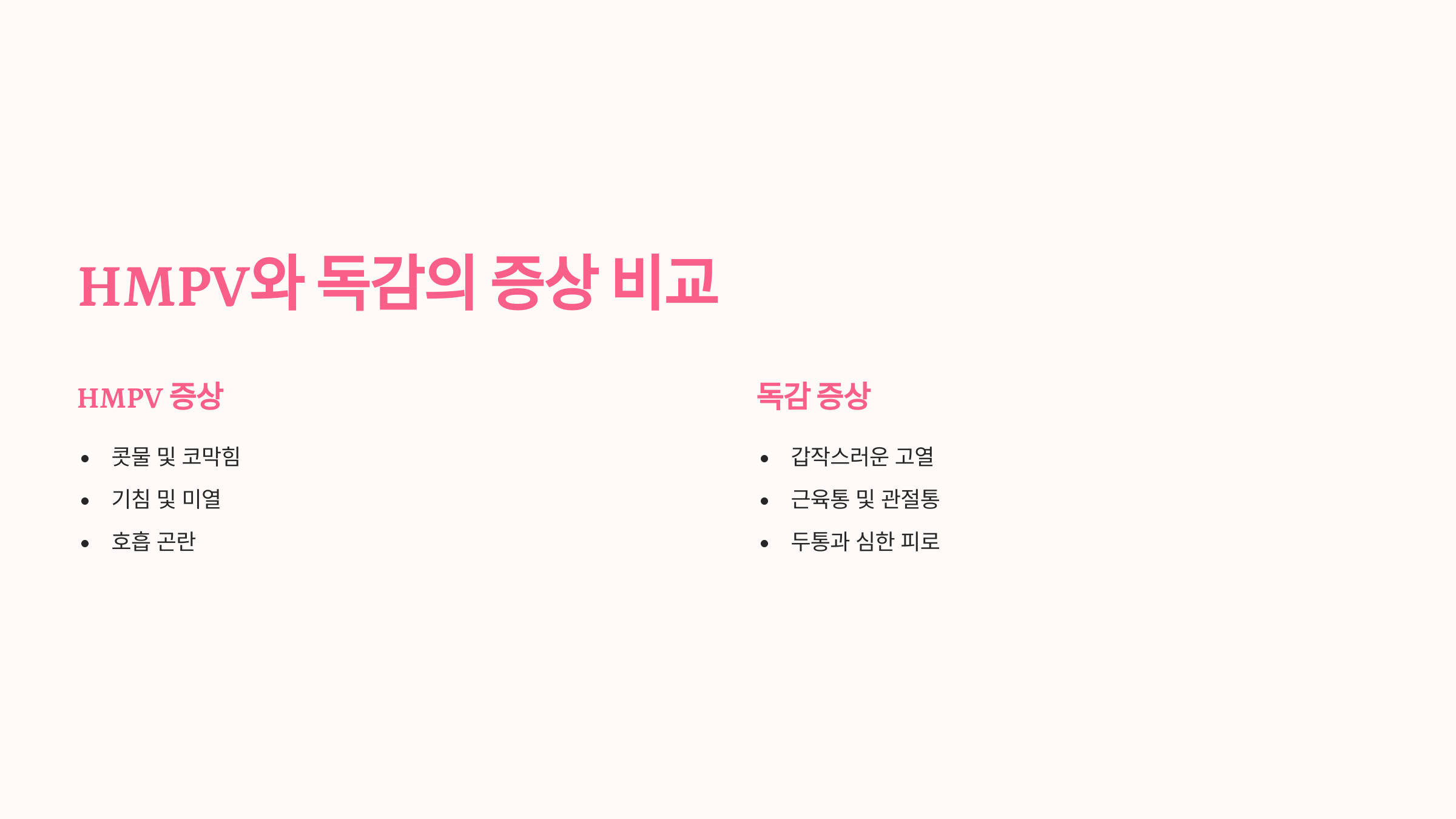 - HMPV는 전염 속도가 독감보다 느리지만, 특정 계층(유아, 노인)에게 심각한 영향을 미칩니다.