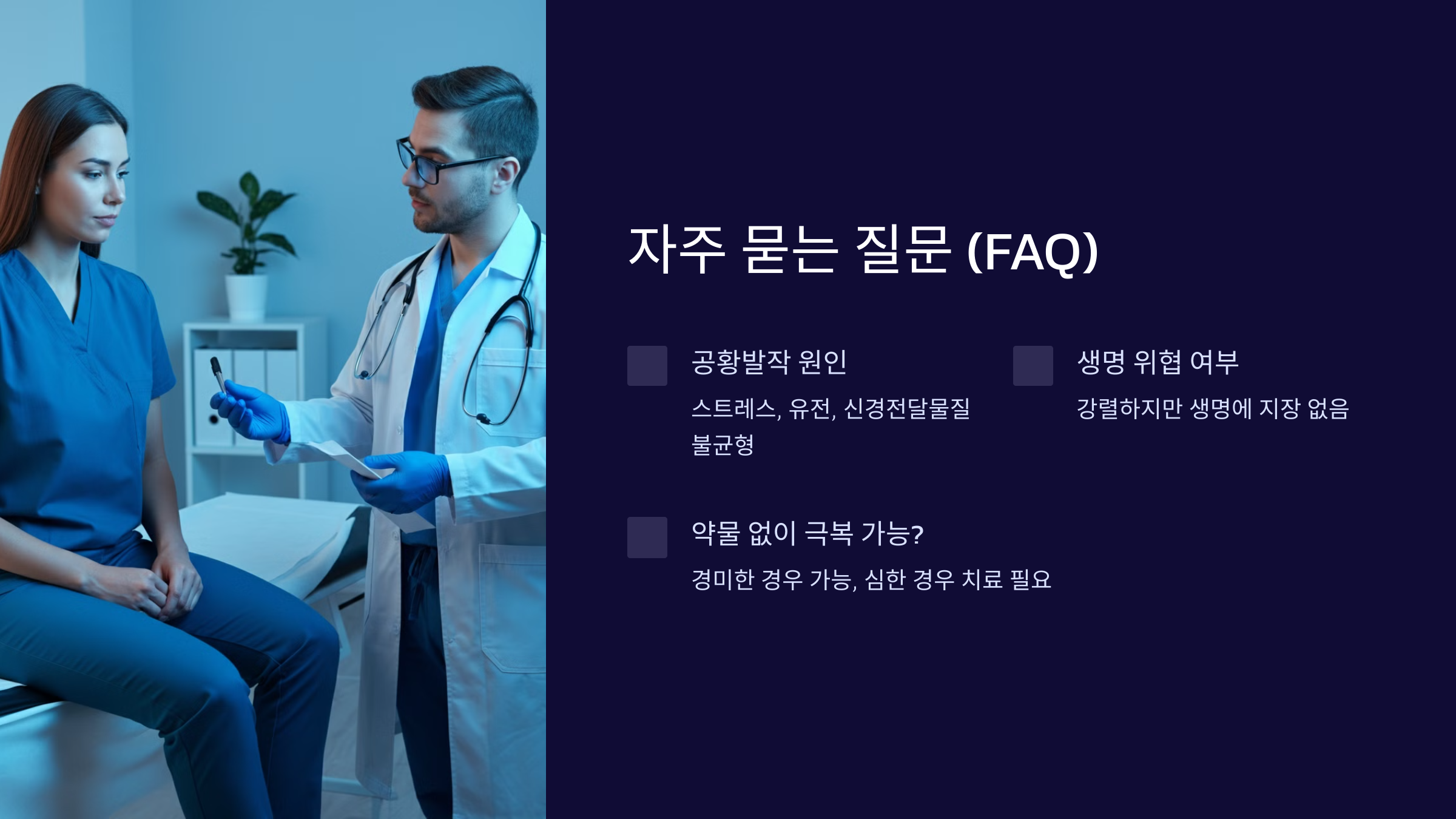 A: 아닙니다. 공황발작은 매우 강렬한 증상을 유발하지만, 생명에는 지장이 없습니다. 다만 반복되면 심리적, 신체적 영향을 줄 수 있으니 적절히 관리해야 합니다.