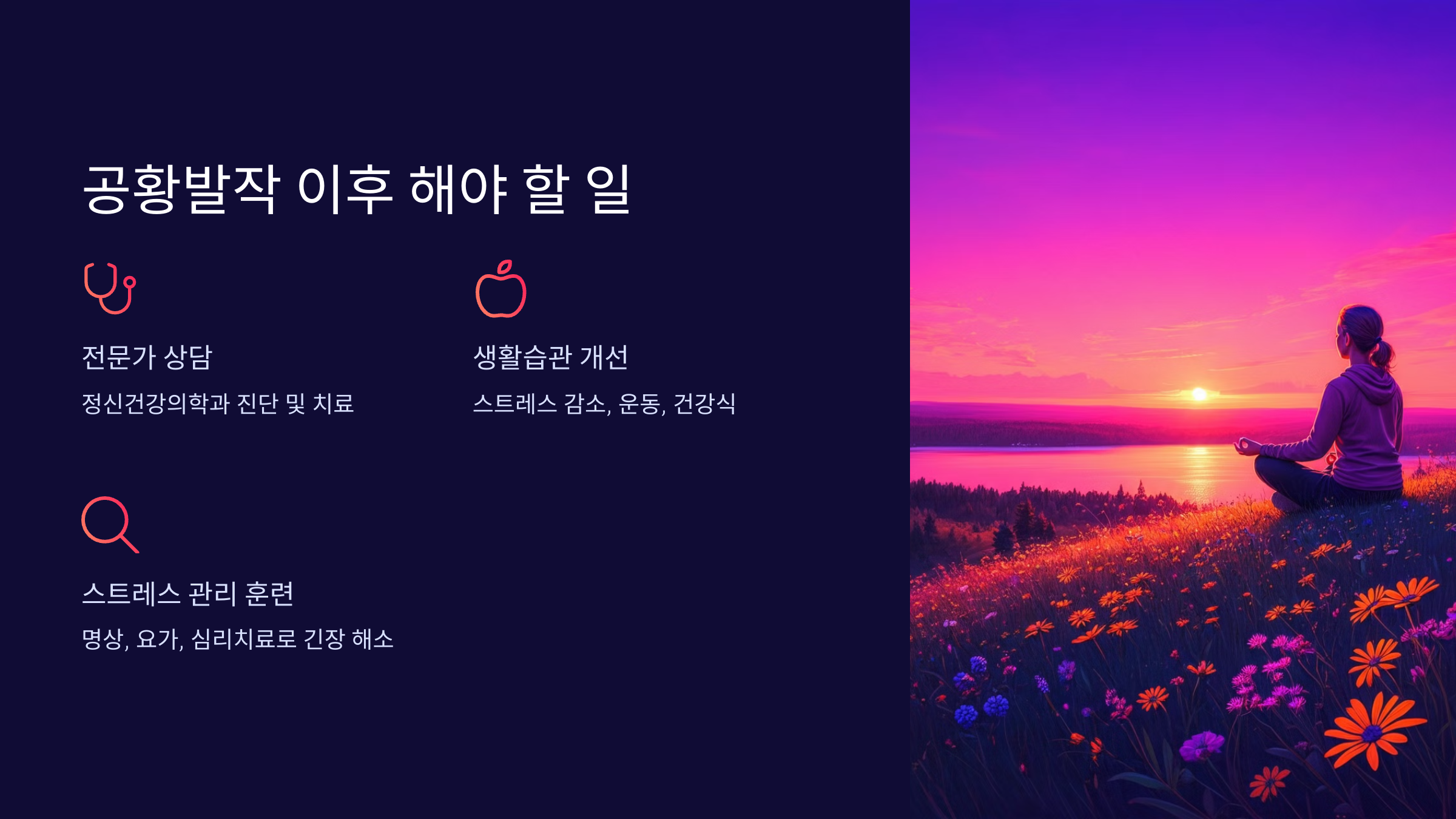 공황발작은 일시적인 증상이지만 반복될 경우 공황장애로 이어질 수 있습니다. 발작이 반복적으로 나타난다면 다음을 실천하세요.
