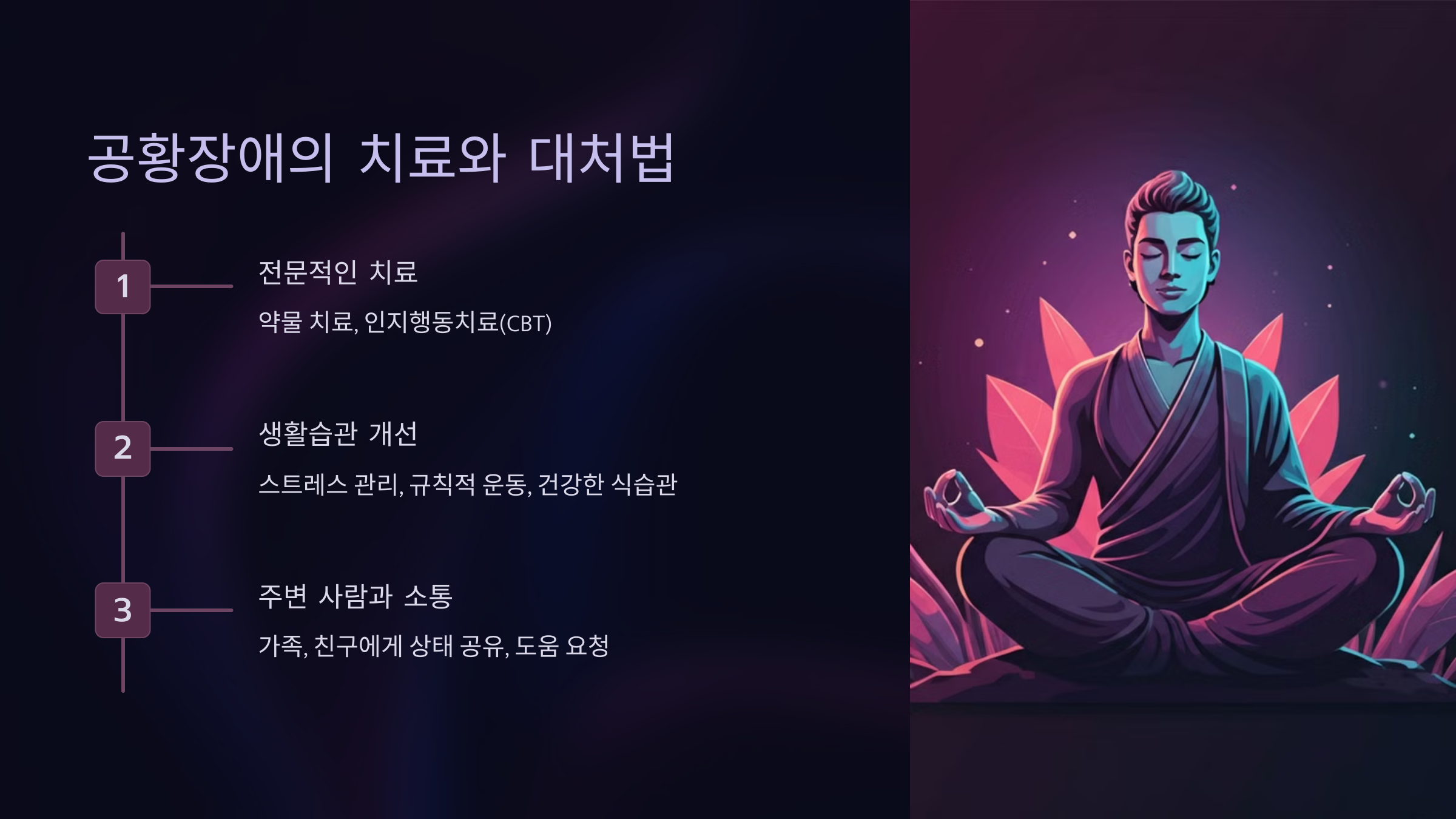 - 인지행동치료(CBT): 공황 발작의 원인을 이해하고 두려움을 극복하는 훈련
