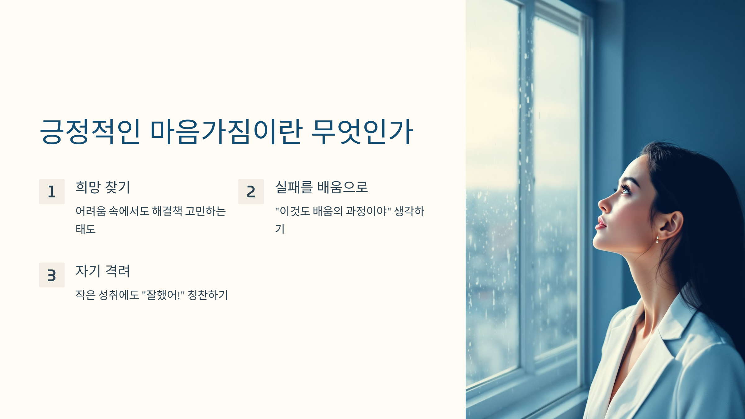 긍정적인 마음가짐은 하루아침에 생기지 않아요. 하지만 작은 습관들이 모이면 큰 변화를 만들어 냅니다. 😊