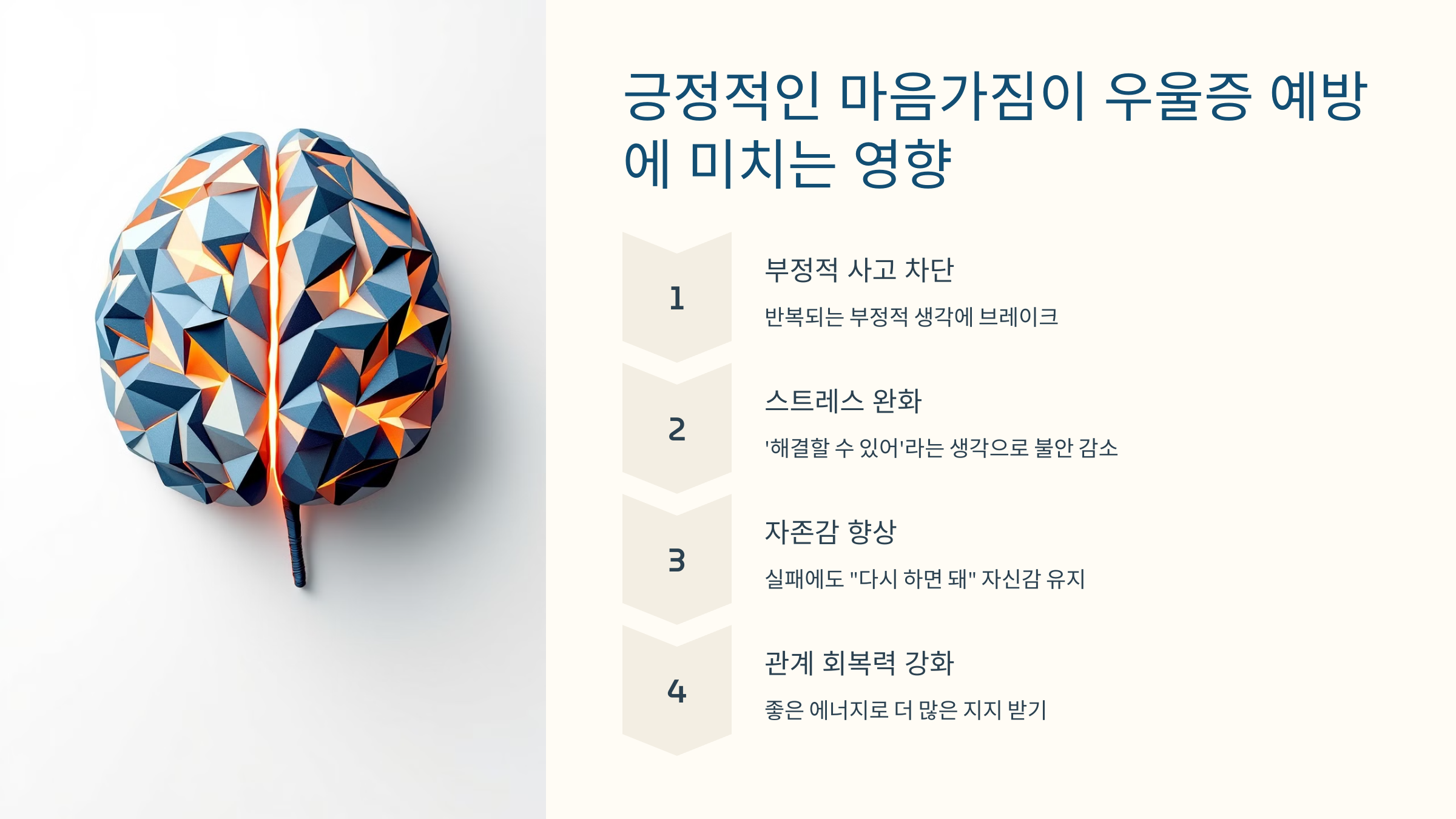 과학적으로도 긍정적인 마음이 우울증 예방에 도움이 된다는 것이 입증되었어요. 🧠✨