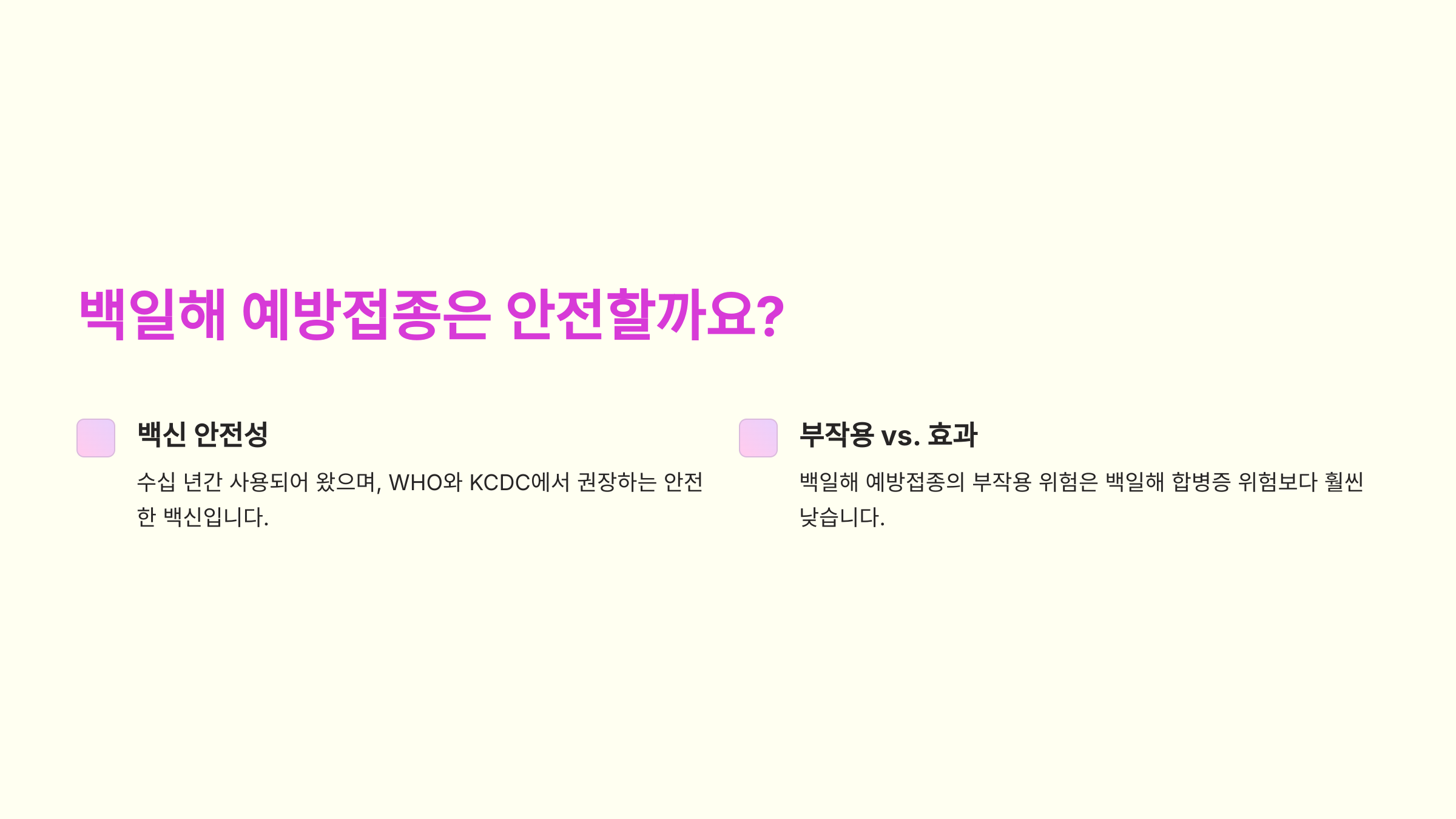 백일해는 전염성이 강하고, 특히 영유아와 면역력이 약한 사람에게 치명적일 수 있는 호흡기 감염병입니다. 이를 예방하기 위한 가장 효과적인 방법은 예방접종(DTaP 또는 Tdap)인데요, 많은 부모님이 백신의 안전성과 부작용에 대해 걱정하시는 경우가 많습니다.