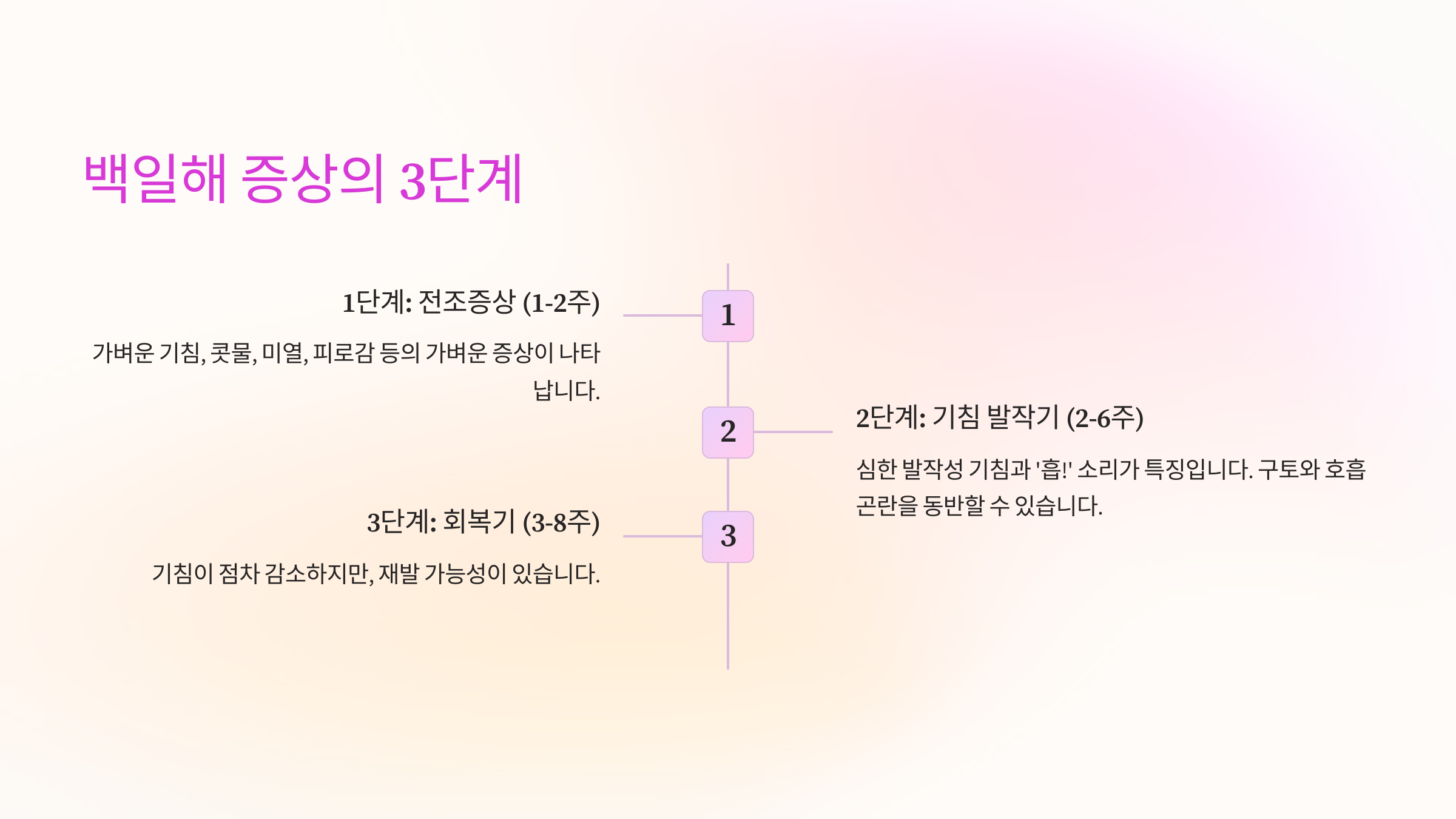 백일해는 크게 3단계로 나뉘며, 초기에 보이는 전조증상(카타르기)은 감기와 비슷해 많은 사람들이 놓치기 쉽습니다.
