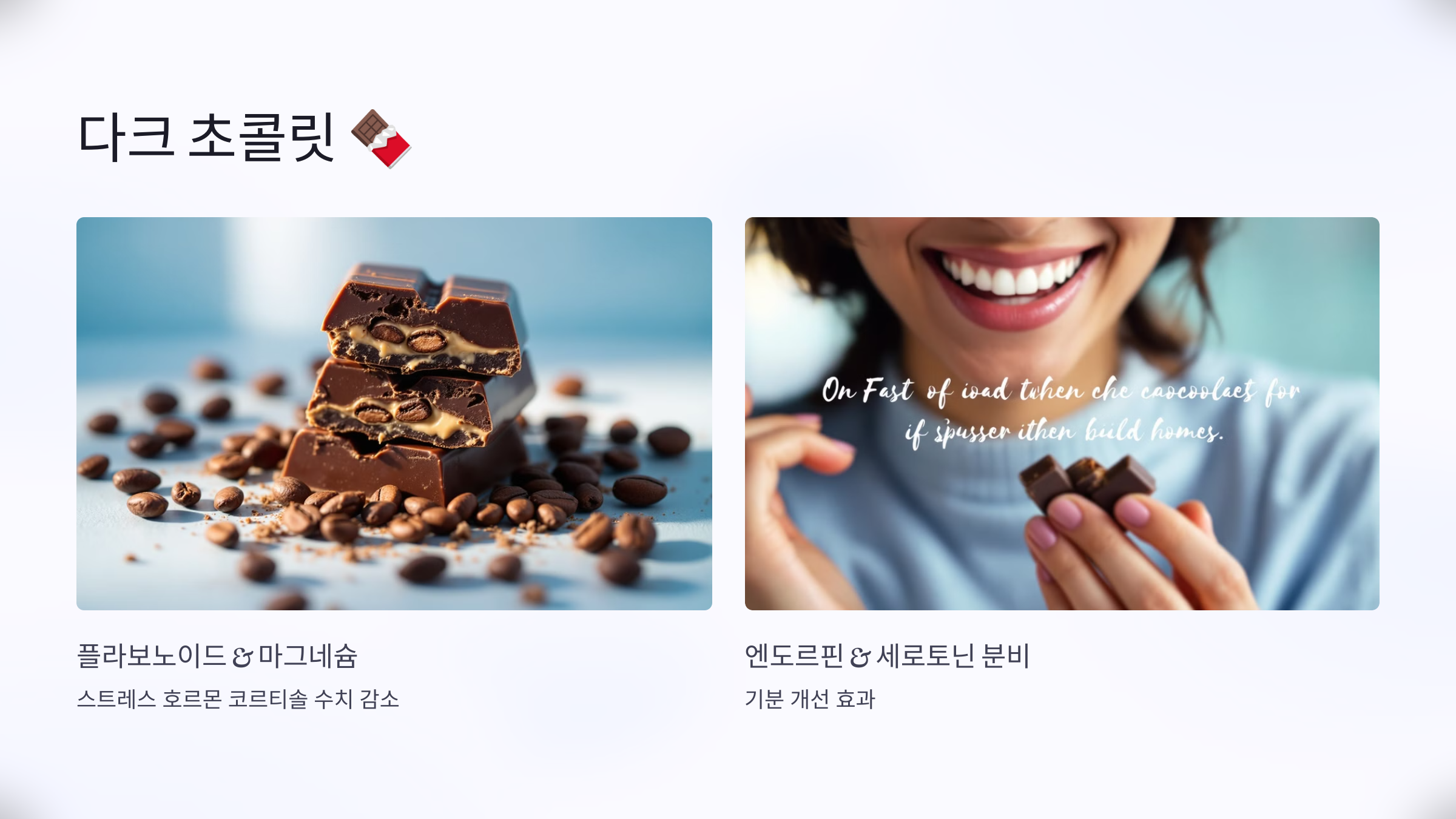- 다크 초콜릿에는 플라보노이드와 마그네슘이 풍부하며, 스트레스 호르몬인 코르티솔 수치를 낮추는 데 도움을 줍니다.