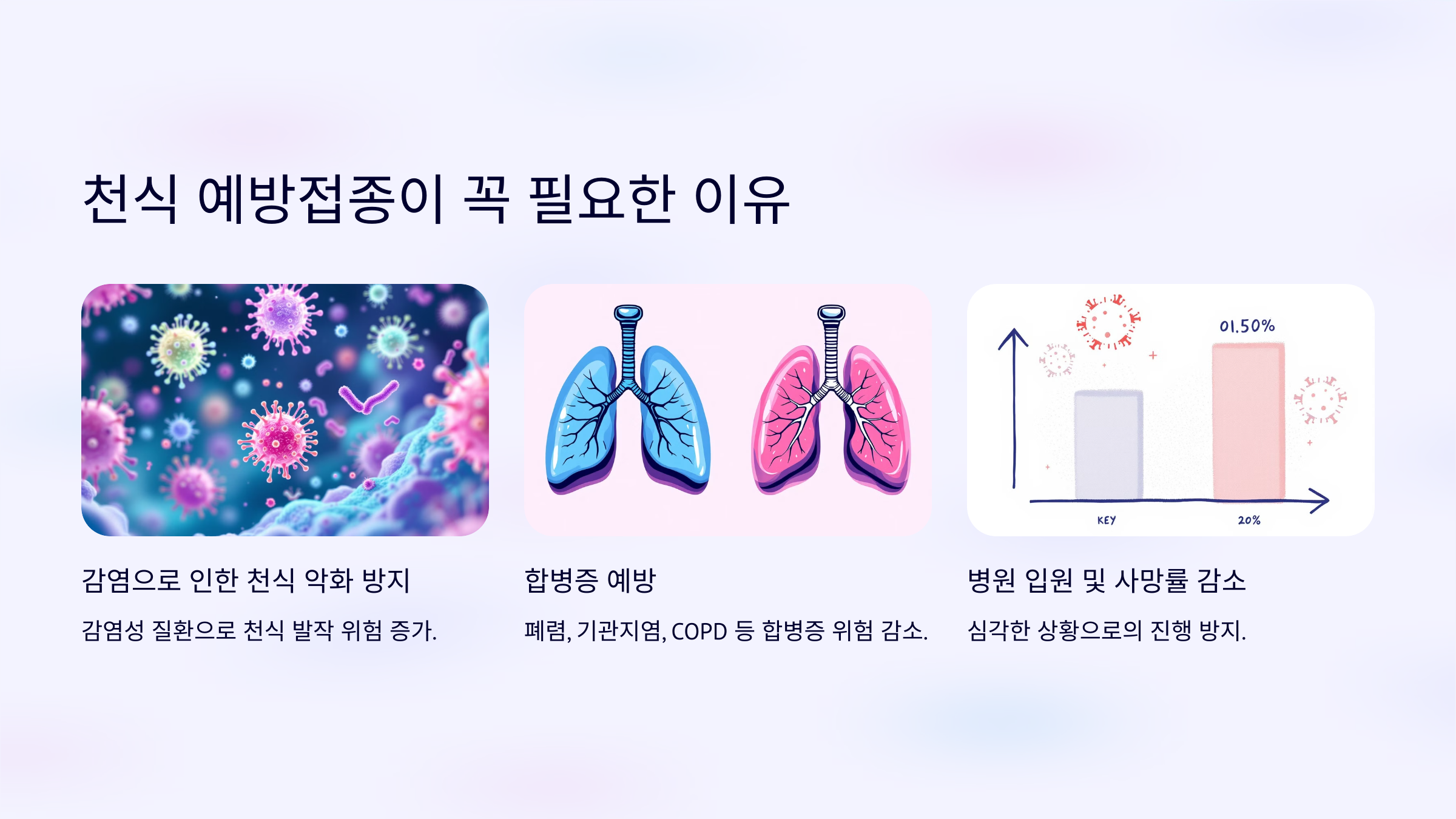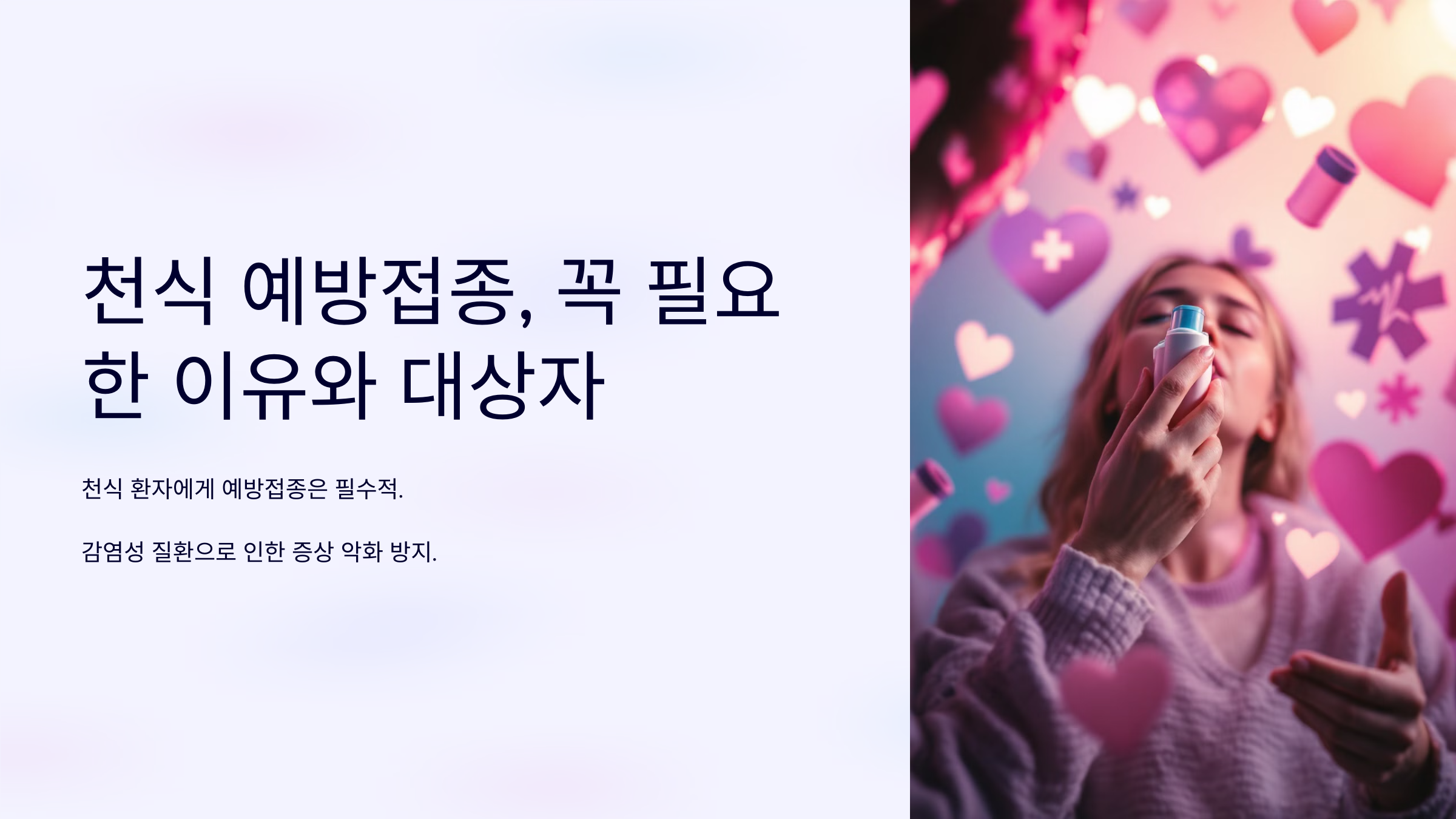 천식은 자체로도 환자의 삶에 큰 영향을 미치는 질환이지만, 감염성 질환이 동반될 경우 증상이 크게 악화되거나 합병증이 생길 위험이 있습니다. 예방접종은 이러한 위험을 최소화하는 중요한 방법입니다.