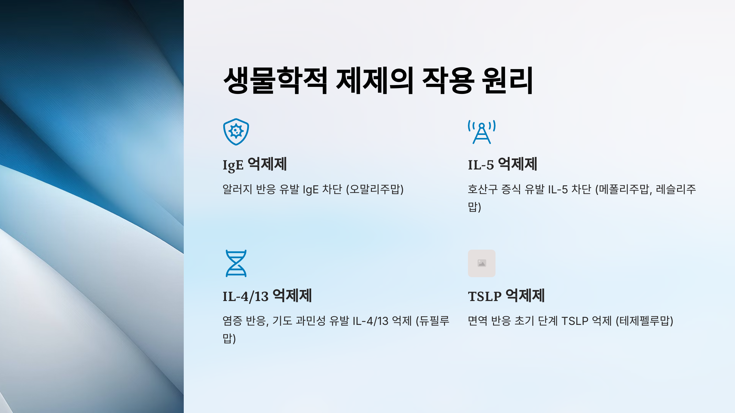 - 천식 치료에 사용되는 생물학적 제제는 주로 천식의 염증 반응과 관련된 특정 단백질(면역 신호 물질)을 억제하거나 차단합니다.
