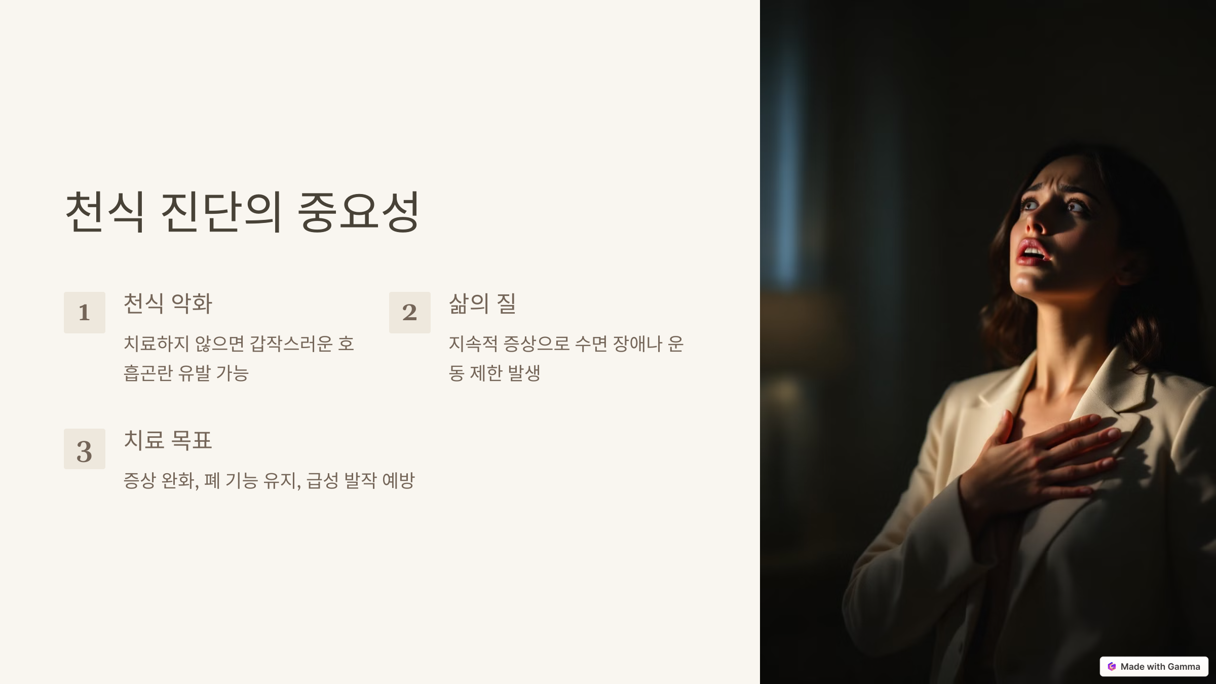 천식은 단순히 "기침이 나고 숨이 차는 병"이 아니에요. 관리하지 않으면 심각한 합병증으로 이어질 수 있답니다.