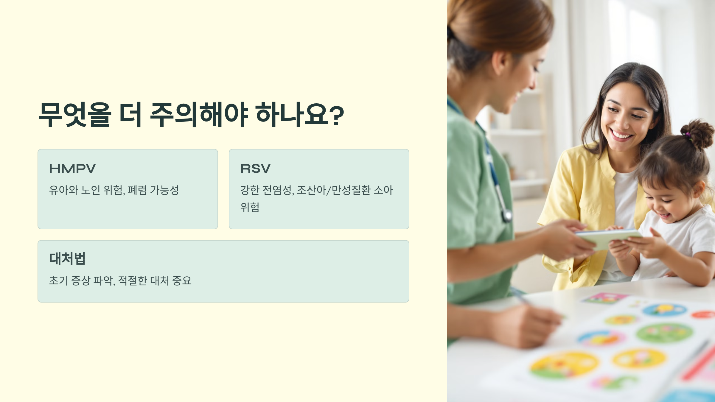 - HMPV는 면역력이 약한 유아와 노인에게 위험하며, 폐렴으로 이어질 가능성이 있습니다.